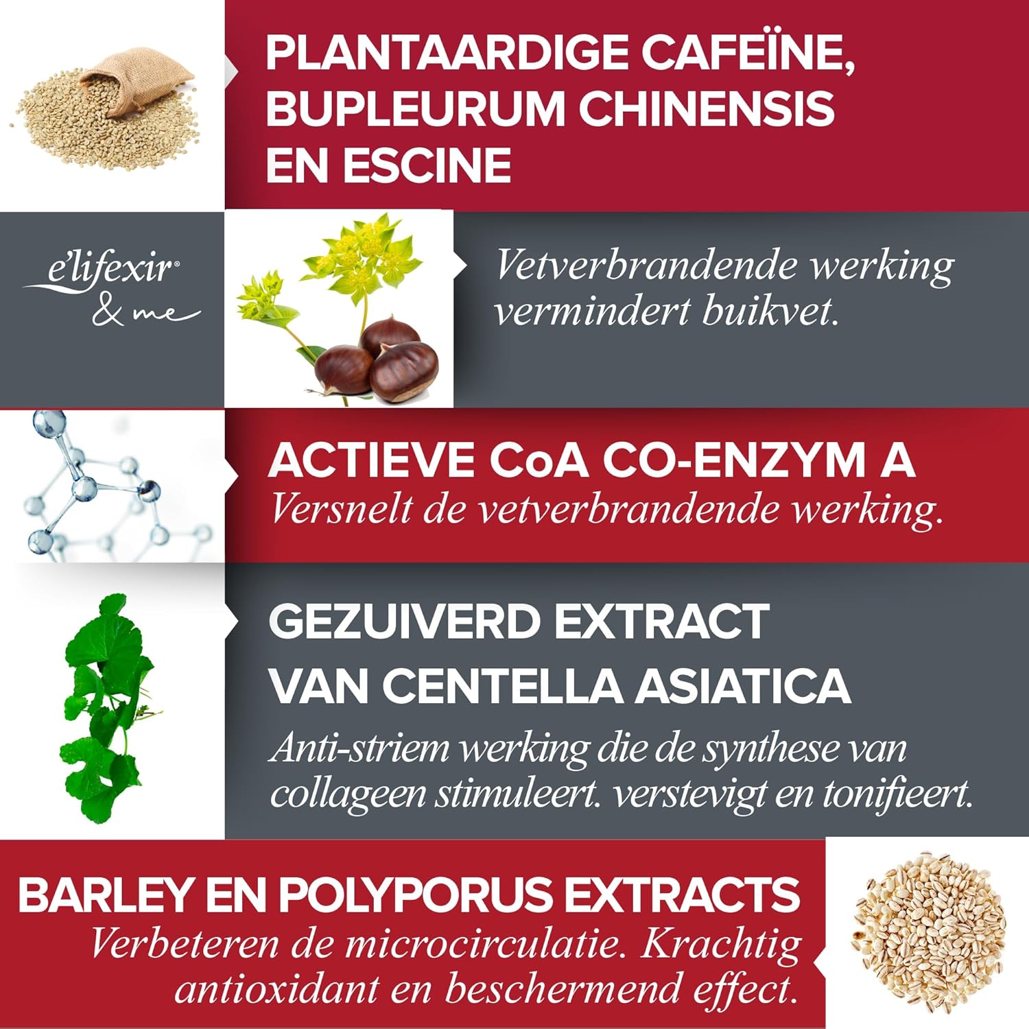VERSNELT DE VETVERBRANDING: Vientre Plano van e’lifexir bevat plantaardige cafeïne, Bupleurum Chinensis en Escine om de lipolyse in het buikgebied te stimuleren. Bovendien bevat de formule het innovatieve biotechnologische actieve CoA Co-enzym A, dat de vetverbranding versnelt door het transport van vetzuren naar de mitochondriën te bevorderen.