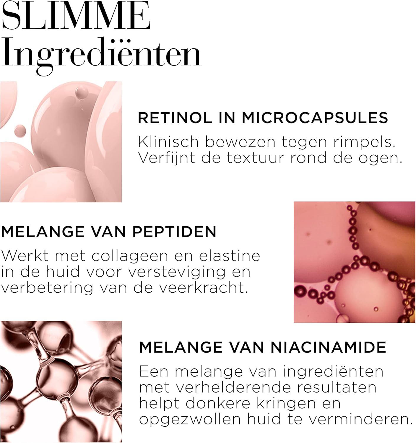 Een cocktail van retinol, peptiden en niacinamide die de delicate huid rond de ogen glad maakt, verheldert, ontlast en langdurig hydrateert.