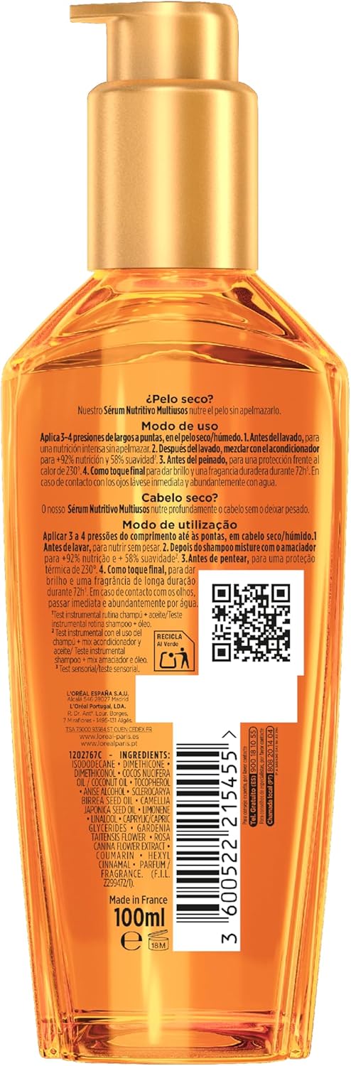 Este aceite ha sido de mi esposa. Tiene el pelo seco y algo dañado por tintes y el uso frecuente de calor, pero este tratamiento ha hecho maravillas. Lo aplica en medios y puntas, ya sea con el pelo húmedo o seco, y el resultado es siempre espectacular: suavidad inmediata, cero encrespamiento y un acabado sedoso sin apelmazar. Además, el aroma es una delicia. Lo ha estado usando durante mucho tiempo y aún queda bastante producto, porque cunde mucho. Totalmente recomendado si buscas un tratamiento nutritivo de calidad para el cabello seco o apagado.