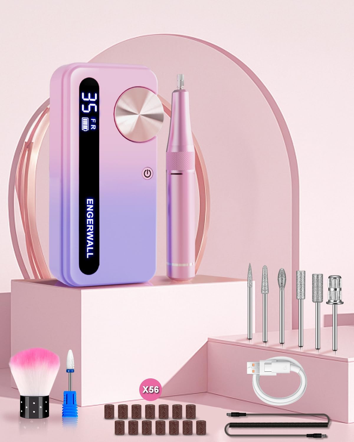 ENGERWALL Elektrische Nagelvijl met 7 Polijstkoppen en 56 Schuurbanden voor Manicure en Pedicure voor het Inkorten, Vijlen, Vormgeven en Verzorgen van Nagels en Nagelriemen, 35.000 tpm, Blauw-Roze