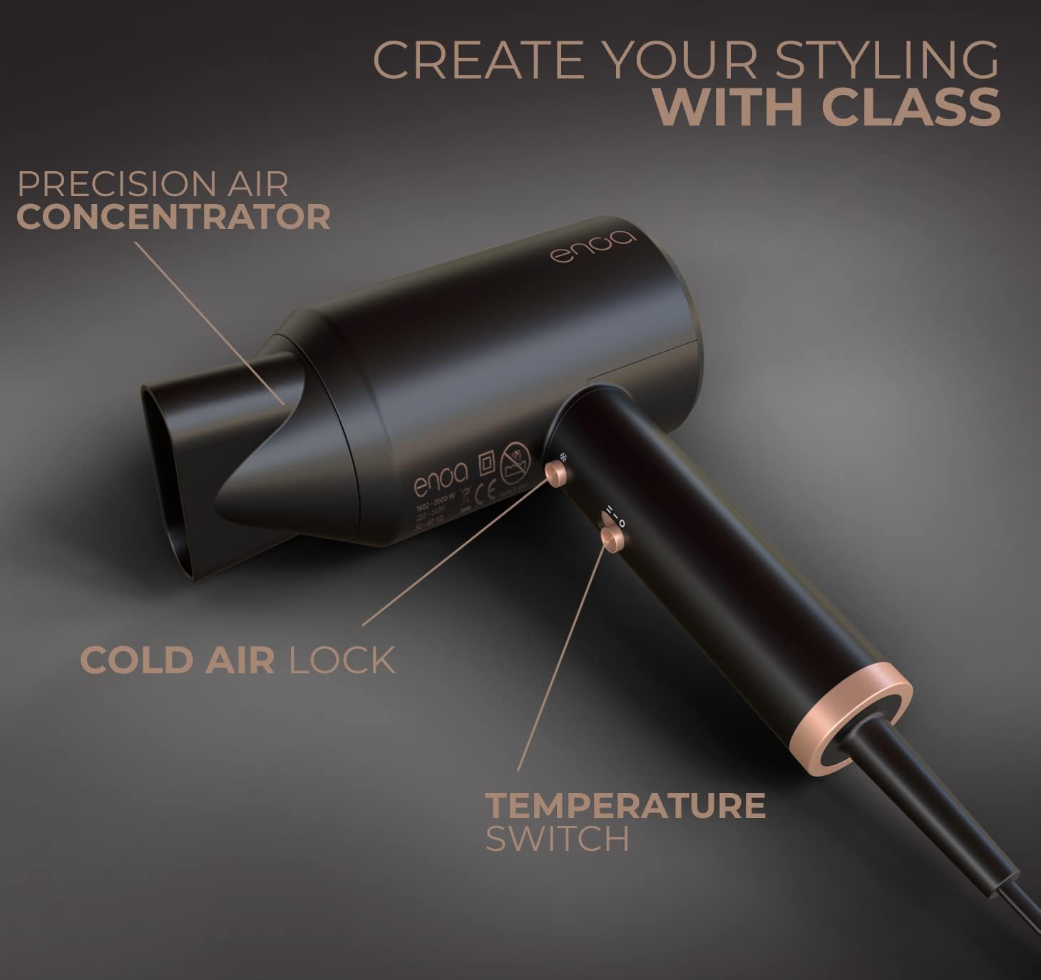 ENOA Professionele Haardroger, 2000W DC-motor, Ionische Anti-Frizzfunctie, Constante Temperatuur, 2 Temperaturen, 4 Snelheden, Stil, Compact Ontwerp