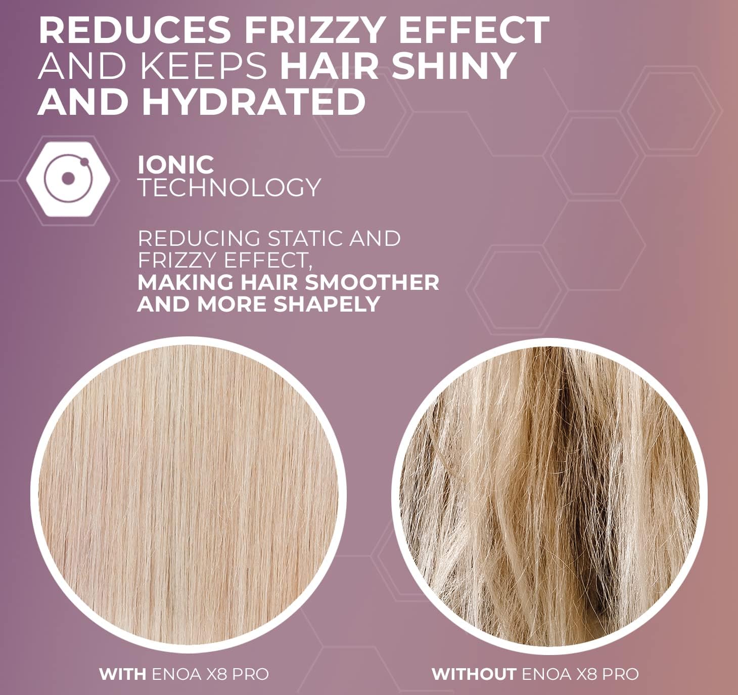 ANTIKROES, ZACHT EN GLANZEND HAAR. Ionische föhn met ionentechnologie voor haar dat altijd glad en glanzend is. Met zijn krachtige luchtstroom vermindert de geïntegreerde ionengenerator statische elektriciteit en verwijdert alle sporen van vocht, waardoor kroezen wordt vermeden, de haarschubben plat worden en glans wordt gegeven. Geschikt voor alle haartypes en lengtes.