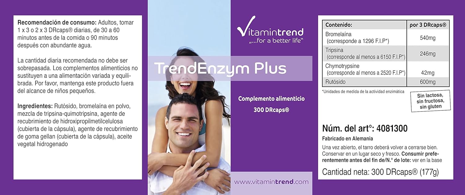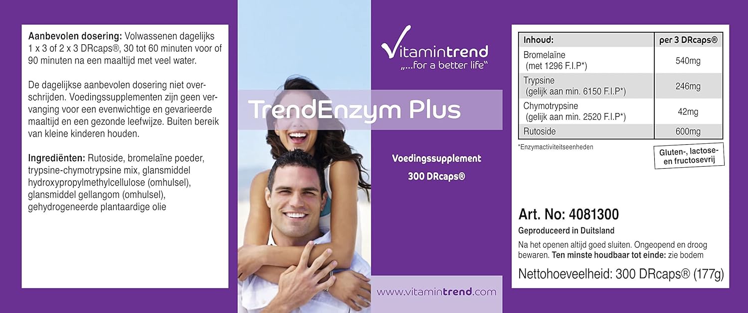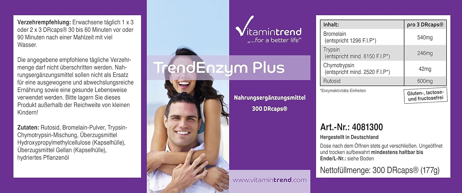 ✅ VITAMINTREND Duitse kwaliteit. Drie capsules bevatten: 540mg bromelaïne, 246mg trypsine en 42mg rutoside – aanbevolen dagelijkse dosis: 3-6 capsules met veel water – hooggedoseerde werkzame stof – uitstekende prijs-kwaliteitverhouding. De enzymen bromelaïne, trypsine en chymotrypsine bevorderen de spijsvertering en de stofwisseling.