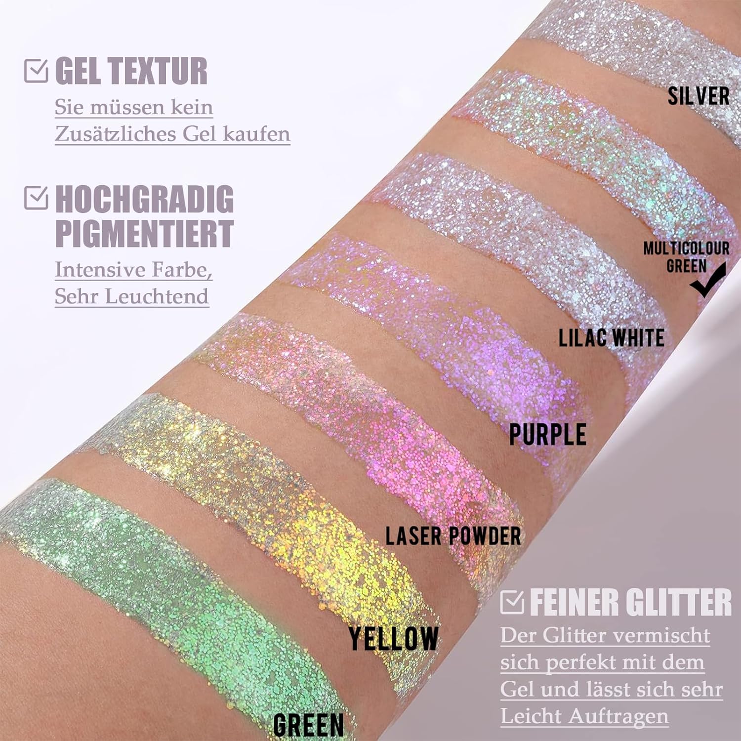 Langdurige glans: de festivalglitter bestaat uit zeer intensieve pigmenten en holografische glans. De kleur en de glans veranderen met het perspectief, zoals bij een regenboog, waardoor je er elegant en glamoureus uitziet en op feestjes en concerten licht in het middelpunt staat.