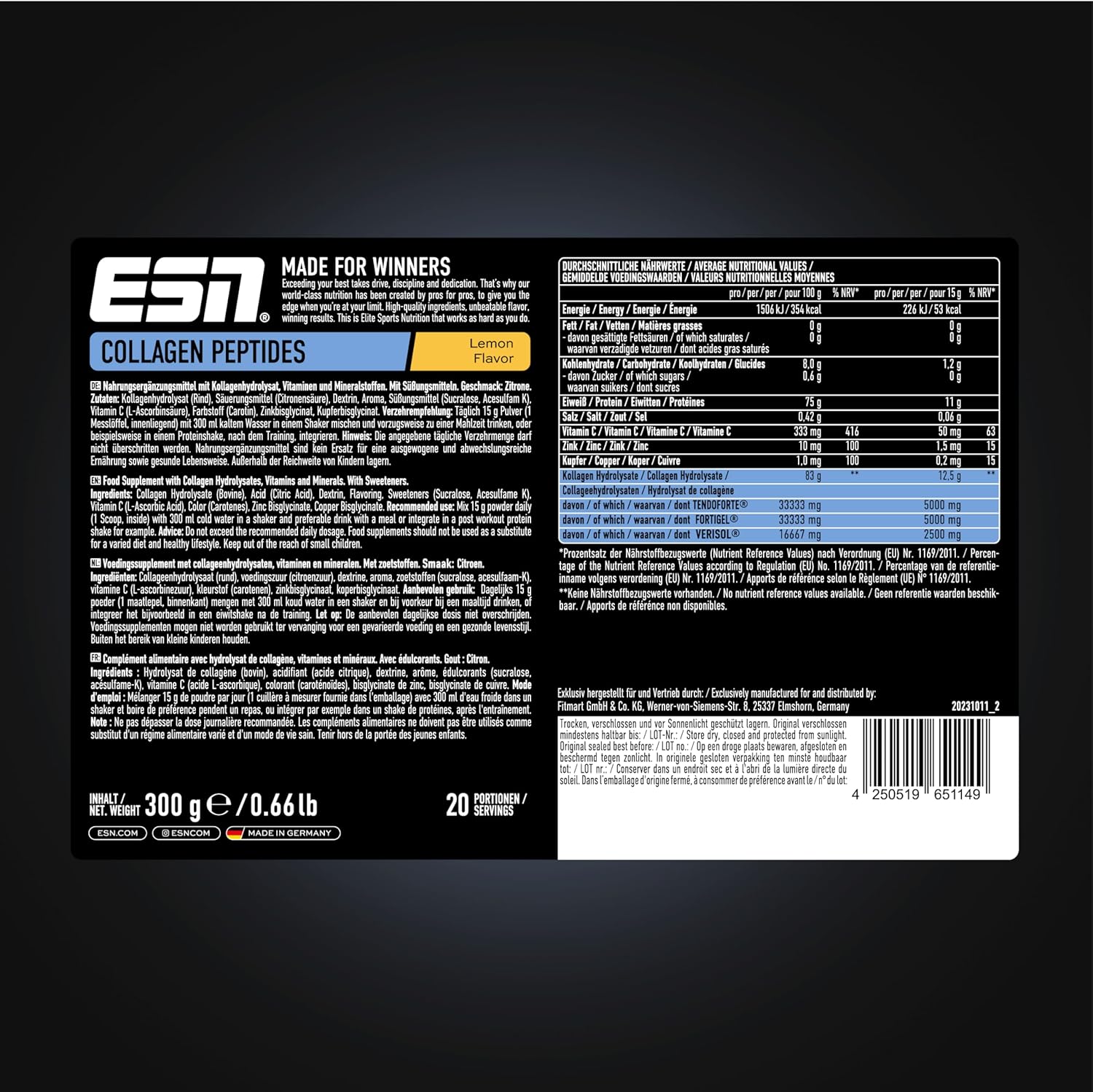 ESN Collagen Peptides, Lemon, 300 g, 20 Porties – Collageenpoeder ter Ondersteuning van Gewrichten, Kraakbeen, Huid en Botten, Gemaakt in Duitsland, Laboratorium Getest