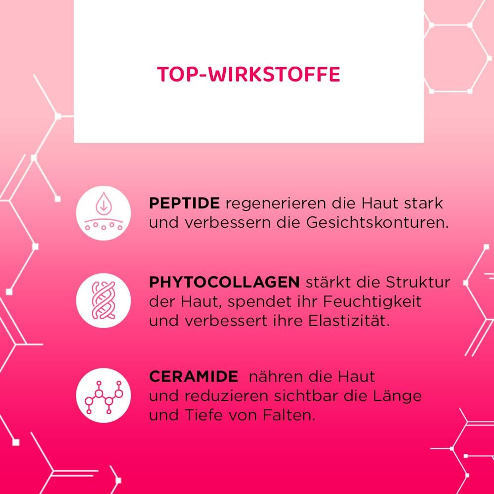 Huideigenschappen: dit geavanceerde serum combineert 12 biomimetische peptiden om de collageensynthese te stimuleren. Het verbetert de huidsterkte en elasticiteit en beschermt tegelijkertijd tegen schade door vrije radicalen.