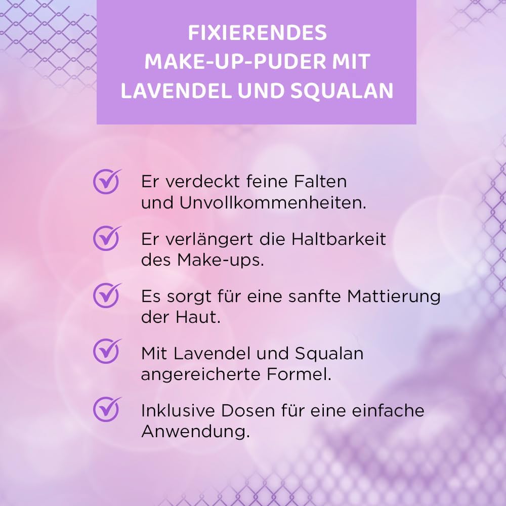 Das Puder lässt sich mit dem beiliegenden “Kissen” gut auf das Gesicht auftragen und mattiert die Haut sehr gut. Das Puder ist “hautfarben” und nicht weiß, wie viele andere Fixierpuder. Dadurch macht es nicht blass und “verschmilzt” gut mit dem natürlichen Hautton. Den Geruch finde ich ungewöhnlich und etwas störend, da es sehr stark nach Lavendel riecht, was mich an eine Oma erinnert. Ansonsten bin ich zufrieden.