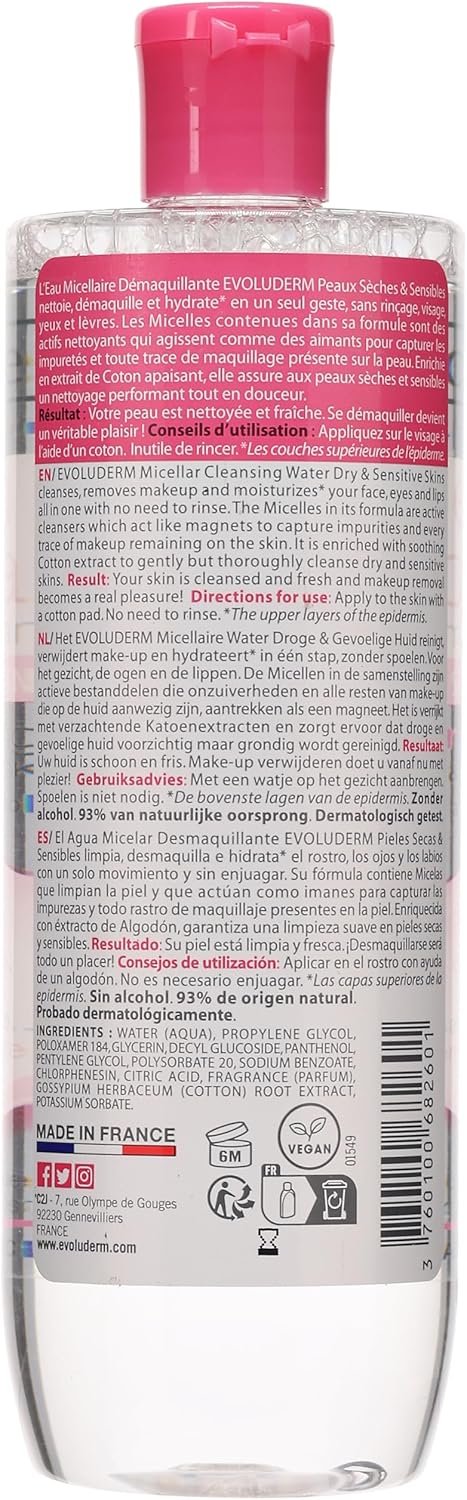 Evoluderm – Micellaire make-up remover, droge en gevoelige huid, 500 ml, gemaakt in Frankrijk
