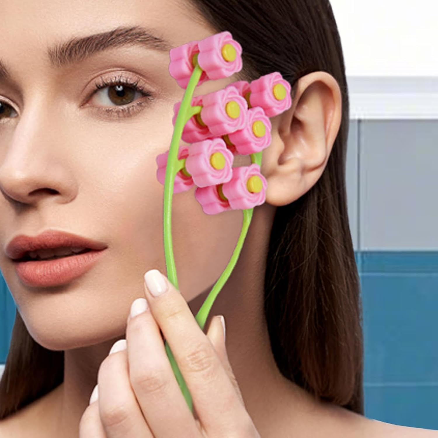 Soothing Face Massage: The Roller’s Elastic Double Clamp Design past de massage aan om bij de unieke kromming van je gezicht te passen, en verbetert ontspanning en verjonging