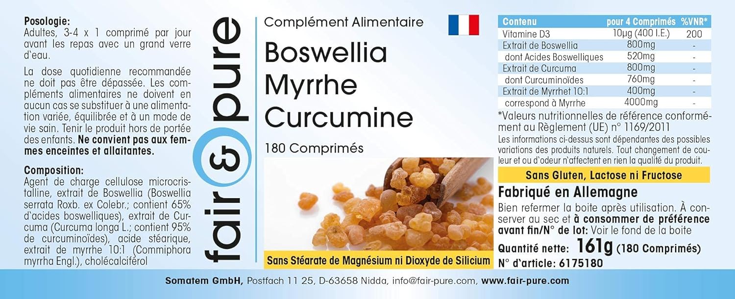 Voor uw gezondheid: Boswellia mirre curcumine – met vitamine D3 – 180 tabletten – Het product is glutenvrij, fructosevrij en lactosevrij en vrij van magnesiumstearaat, siliciumdioxide, kleur- en smaakstoffen en conserveringsmiddelen