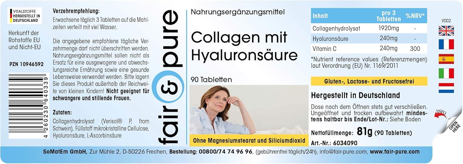 Voor uw gezondheid: Collageen met hyaluronzuur en vitamine C, 90 tabletten – Het product is glutenvrij, fructosevrij en lactosevrij en vrij van magnesiumstearaat, siliciumdioxide, kleur- en smaakstoffen en conserveringsmiddelen