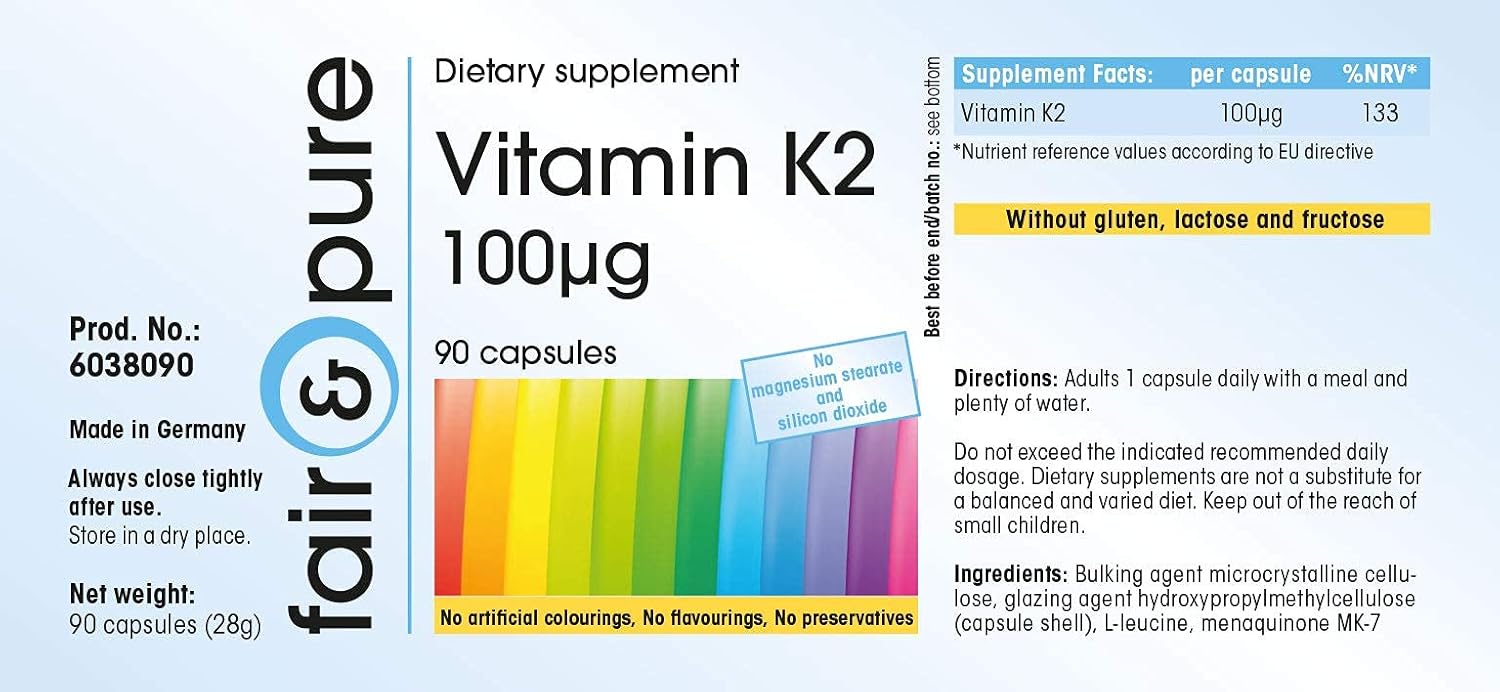Vitamin K2 100µg, natürlich, vegan,MK-7, 90 Kapseln Fair & Pure Vitamin K2 enthält 100µg natürliches Menaquinon MK-7 aus Natto. – 100µg Vitamin K2 MK-7 pro Kapsel – natürliches Menaquinon aus Natto – MK-7 – vegan, glutenfrei, lactosefrei, fructosefrei – ohne Magnesiumstearat und Siliciumdioxid – PZN 10920641 Verzehrempfehlung: Erwachsene täglich 1 Kapsel zu einer Mahlzeit mit viel Wasser Eine Kapsel enthält / %NRV*: natürliches Menaquinon MK-7 100µg / 133% *NRV: Nutrient reference values (Referenzmengen) laut EU-Verordnung Zutaten: Füllstoff mikrokristalline Cellulose, Überzugsmittel Hydroxypropylmethylcellulose (Kapselhülle), L-Leucin, Menaquinon MK-7 Nettofüllmenge: 28g/90 Kapseln Hinweis: In Deutschland dürfen wir als Hersteller von Nahrungsergänzungsmitteln aufgrund rechtlicher Vorgaben keine Hinweise zu der Wirkung von Nahrungsergänzungsmitteln geben. Bitte informieren Sie sich auf z.B. Fachseiten im Internet oder in entsprechender Fachliteratur vor einem Kauf unserer Produkte.
