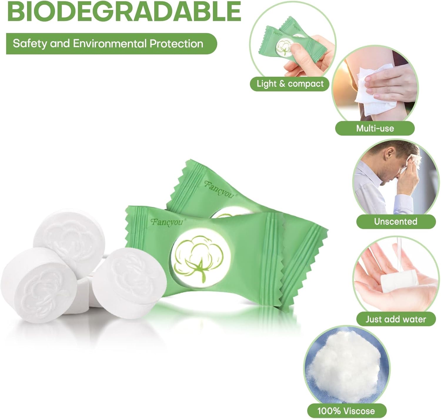 Fancyou Persdoekjes Wegwerp Gezichtsdoekje 300 Stuks, Verdikkend Compressed Towels Mini Reisbenodigdheden,Compacte Draagbare Was Katoenen Doekjes Tabletten Muntdoekjes om Alles Schoon te Maken(Groen)