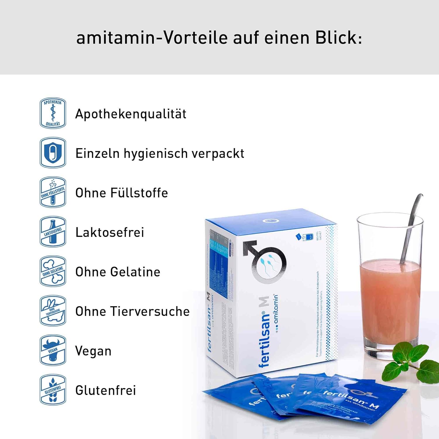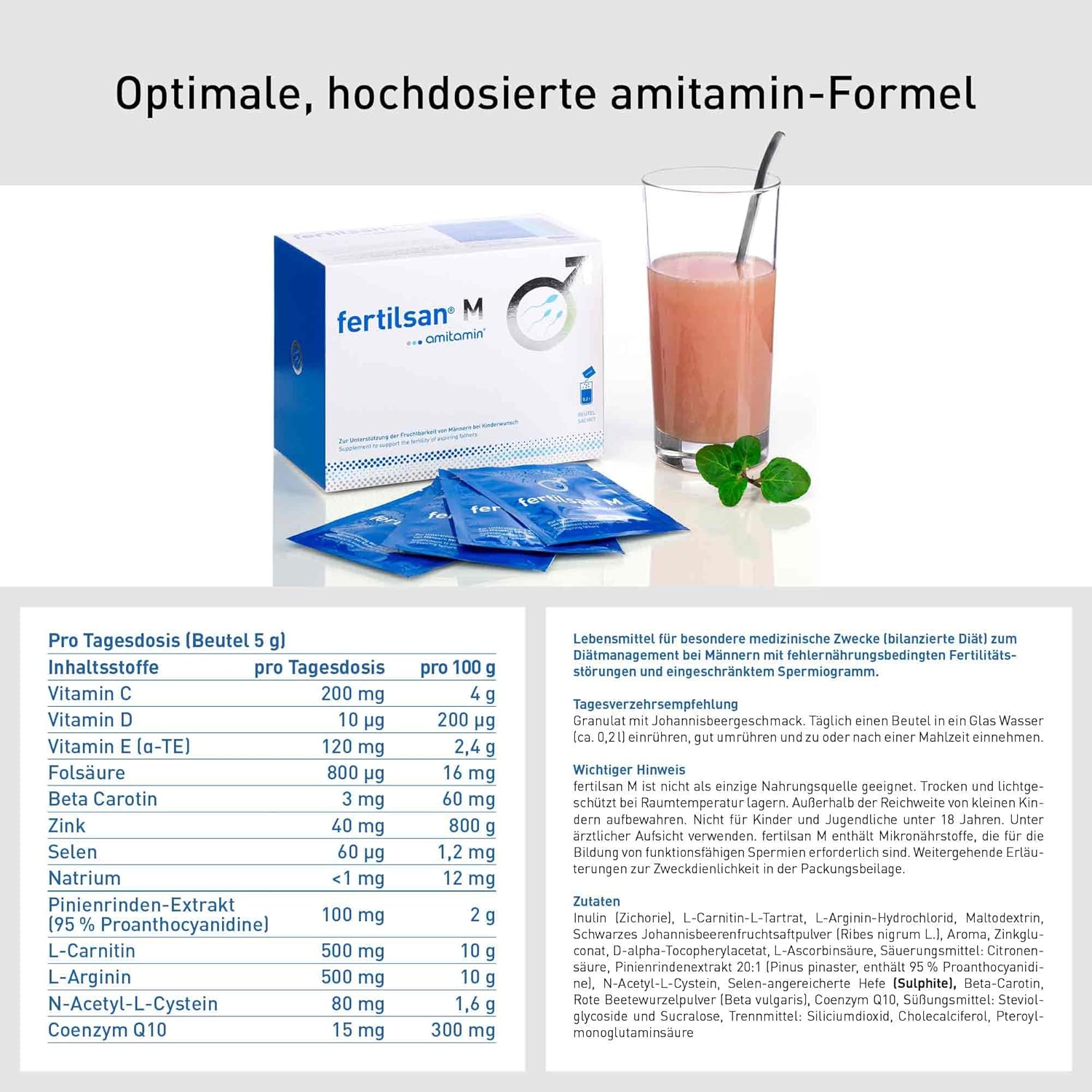 fertilsan M van amitamin is een aanvullend op de balans opgenomen dieet voor de dieetbehandeling van mannen met vruchtbaarheidsstoornissen (dieetvoeding voor medisch gebruik). Door de uitgebalanceerde en hoge dosering van speciale micronutriënten kan fertilsan M bijdragen aan de verbetering van de kwaliteit van het mannelijke sperma en daarmee de vruchtbaarheid van mannen met een verminderde vruchtbaarheid als gevolg van de voedingsgerelateerde verminderde vruchtbaarheid.