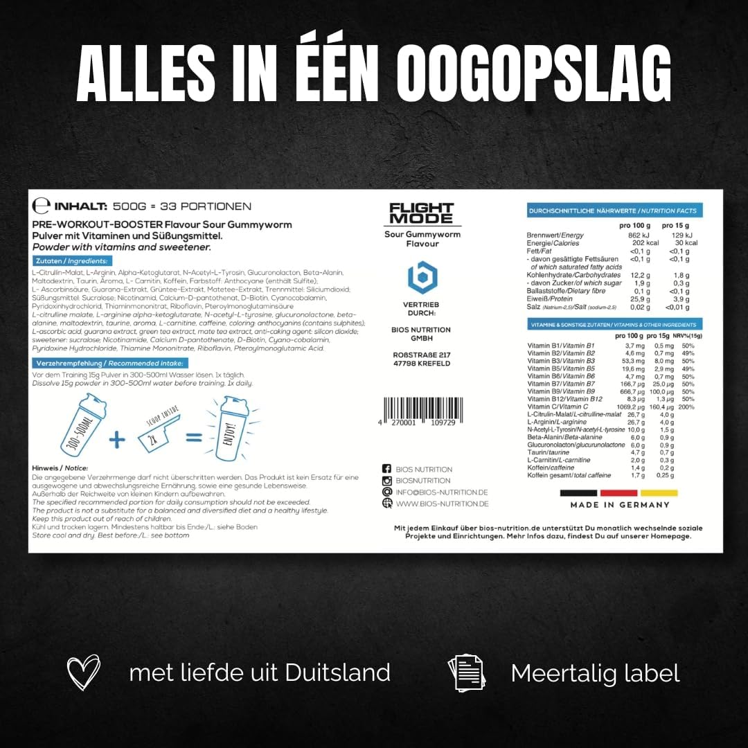 FLIGHTMODE Pre-Workout Booster 500gr (Zure gummiworm) Vegan – 33 porties – geen tinteling & zonder creatine – Bios Nutrition (Gemaakt in Duitsland)