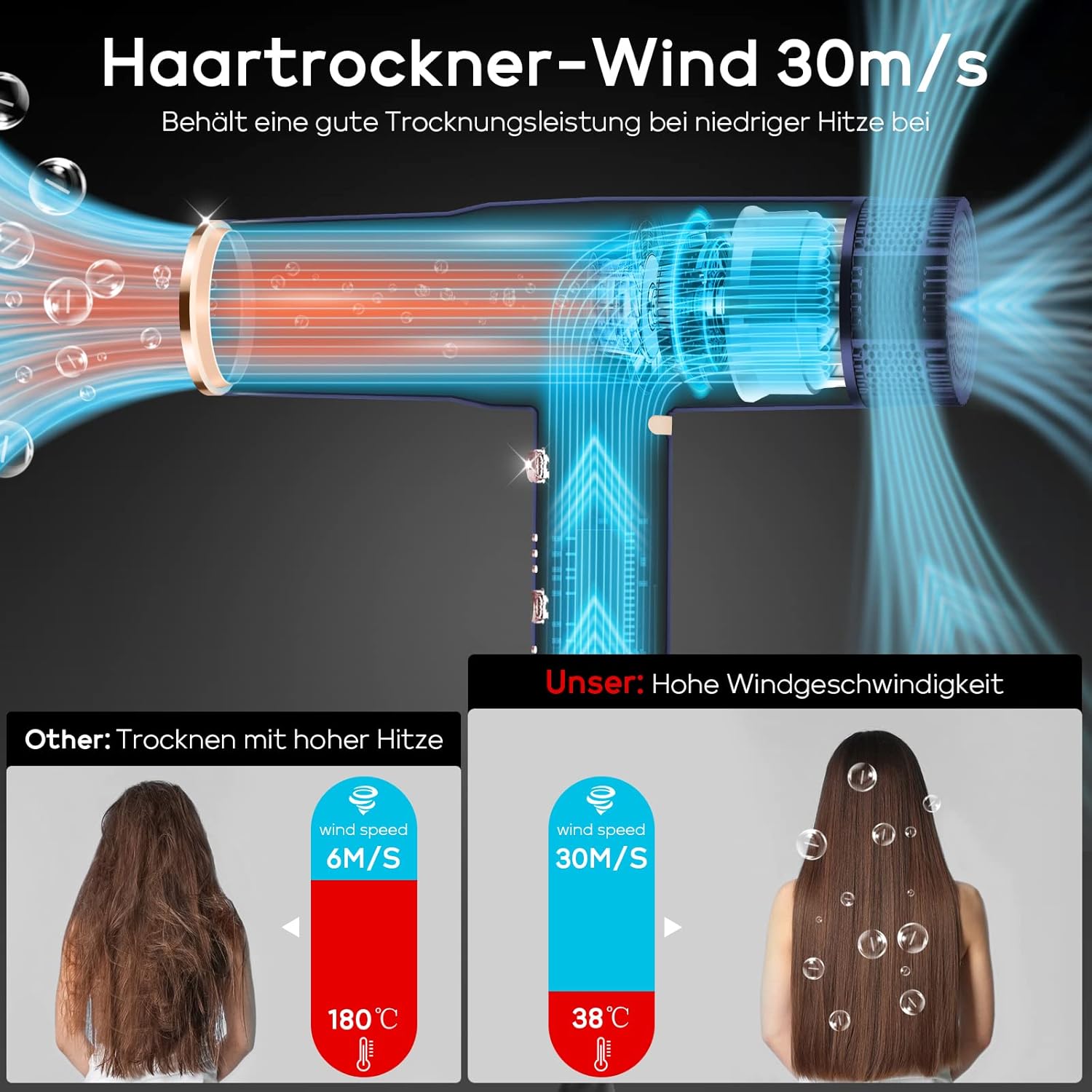 Föhn Professionele 100 miljoen negatieve ionen haardroger, met unieke borstelloze geluidsarme motor, 30 m/s luchtstroom voor snelle droging, innovatieve microfilter (blauw)