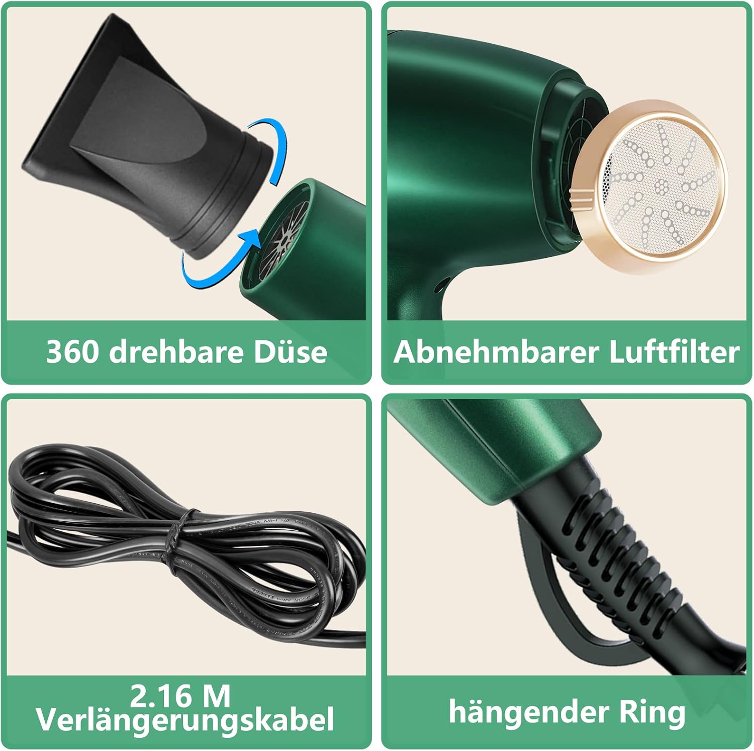 Föhn Professionele föhn, ionen-haardroger, 2400 W, haarföhn met diffuser, stylingmondstuk, 2 snelheden en 3 verwarmingsAC-motor, sneldrogend, krachtige haarföhn voor haarsalon en familie (groen)