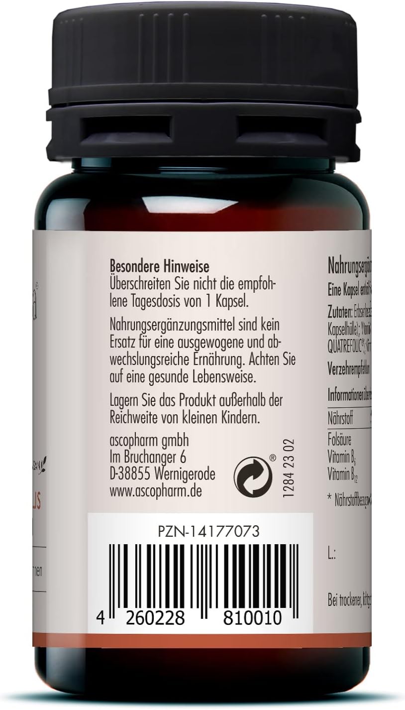 Grondstof QUATREFOLIC foliumzuur in bioactieve vorm kan door het lichaam zonder metabolisatie direct worden gebruikt. De voorraad is voldoende voor een half jaar. Belangrijk als aanvulling voor en tijdens de zwangerschap en borstvoeding.