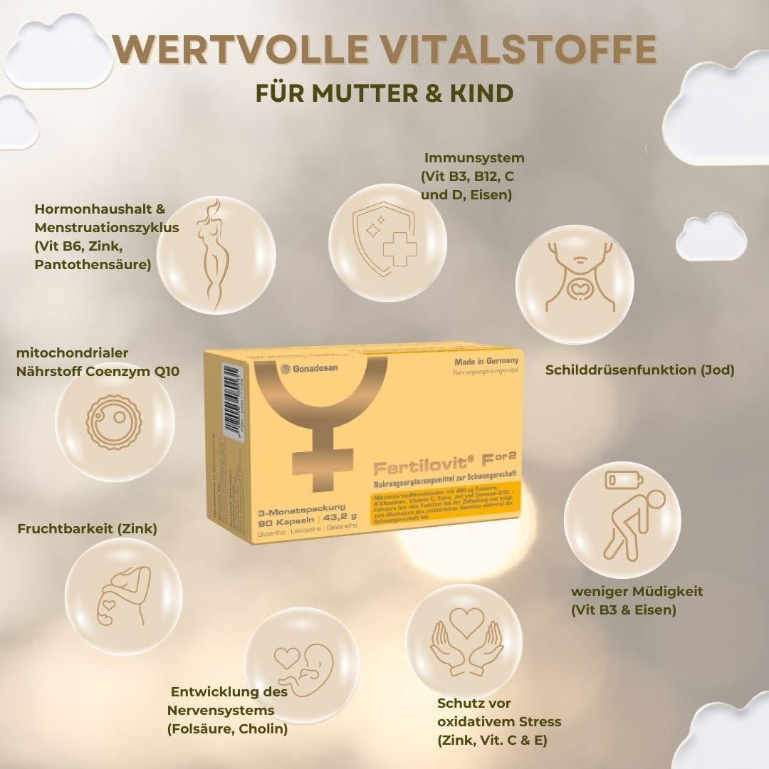 Meine Frau hat sie während der Schwangerschaft und Stillzeit eingenommen, und sie hat bemerkt, dass sie sich energiegeladener fühlt und ihre allgemeine Gesundheit unterstützt wird. Die Kombination aus wichtigen Vitaminen und Mineralstoffen ist perfekt abgestimmt, um den erhöhten Bedarf während dieser besonderen Lebensphasen zu decken.Ein großer Vorteil der Fertilovit For2 Vitamine ist die vegane Zusammensetzung. Da wir auf tierische Produkte verzichten, passt dieses Produkt ideal zu unserem bewussten Lebensstil. Die Kapseln sind gut verträglich und verursachen keine unangenehmen Nebenwirkungen, was besonders wichtig ist, wenn man regelmäßig Nahrungsergänzungsmittel einnimmt. Die Herstellung in Deutschland und die hohe Qualitätskontrolle geben uns zusätzliches Vertrauen in die Sicherheit und Wirksamkeit der Vitamine.**Praktische 3-Monatspackung für langanhaltende Versorgung**Die Packung enthält 90 Kapseln, was eine Versorgung für drei Monate bedeutet. Dies ist besonders praktisch, da wir nicht ständig nachkaufen müssen und immer gut versorgt sind. Die Einnahme gestaltet sich einfach, da die Kapseln leicht zu schlucken sind und keinen unangenehmen Geschmack haben. Ein kleiner Nachteil könnte die Größe der Kapseln sein, die für einige Familienmitglieder etwas groß erscheinen könnte. Dennoch überwiegen die positiven Aspekte deutlich.**Unterstützung für Gesundheit und Wohlbefinden**Seit der Einnahme der Fertilovit For2 Vitamine hat sich die Haut meiner Frau verbessert und sie fühlt sich insgesamt gesünder. Auch ich selbst bemerke, dass wir beide von der zusätzlichen Nährstoffzufuhr profitieren, was besonders während der Stillzeit wichtig ist. Die Vitamine unterstützen nicht nur die körperliche Gesundheit, sondern auch das allgemeine Wohlbefinden, was für uns als frischgebackene Eltern von großer Bedeutung ist.**Fazit**Die Fertilovit For2 veganen Premium Vitamine sind eine ausgezeichnete Wahl für alle Mütter, die während Schwangerschaft und Stillzeit eine hochwertige und zuverlässige Nahrungsergänzung suchen. Sie bieten eine umfassende Unterstützung für die Gesundheit von Mama und Baby und passen perfekt zu einem bewussten, veganen Lebensstil. Trotz kleiner Verbesserungsmöglichkeiten sind wir sehr zufrieden mit dem Produkt und können es jedem empfehlen, der nach hochwertigen Vitaminen für diese wichtigen Lebensphasen sucht.