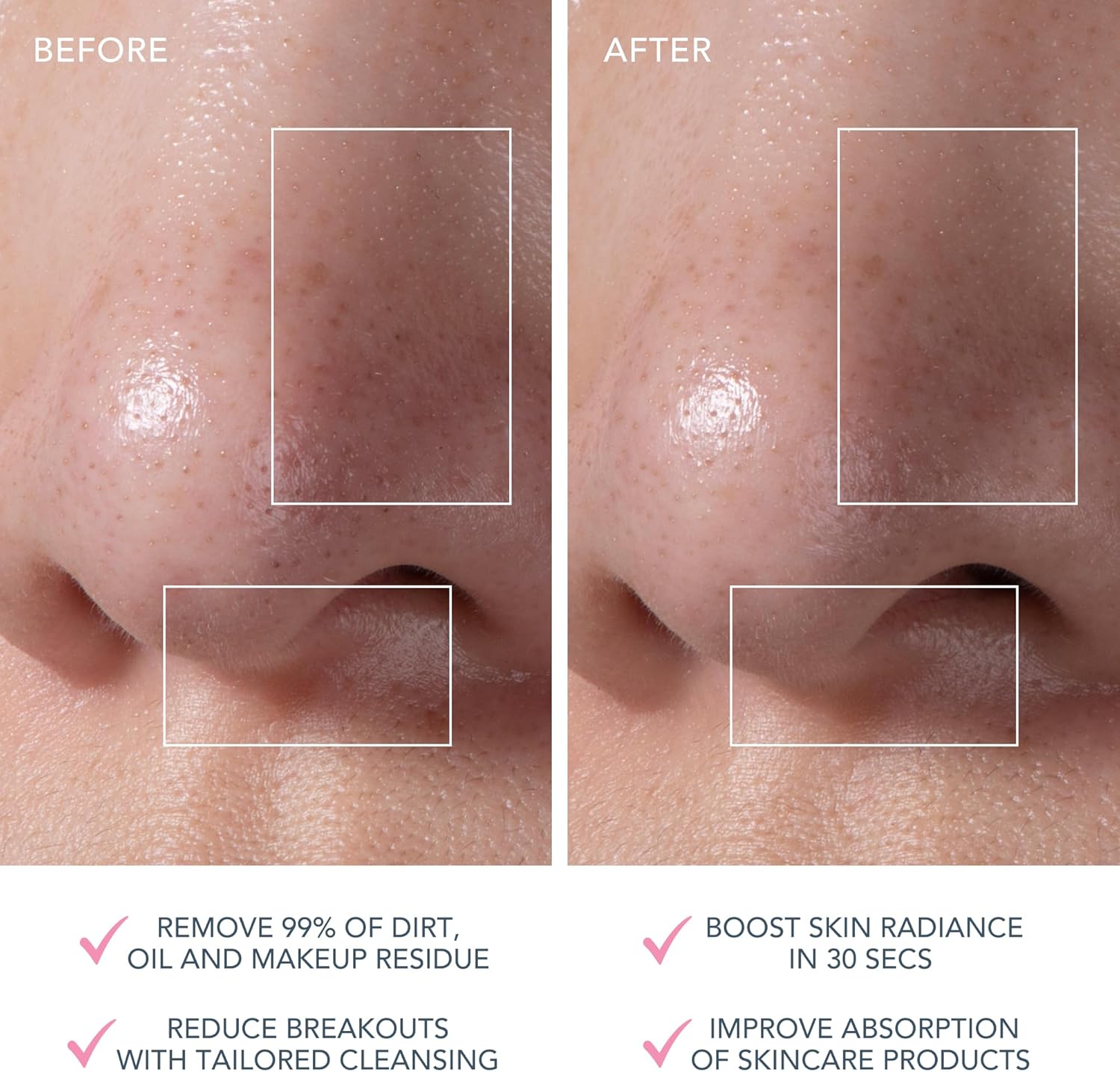 Strakke massageborstels en gezichtsreiniging met de zachtste ultrahygiënische siliconen om 99% van de verontreinigingen in 1 minuut te verwijderen.