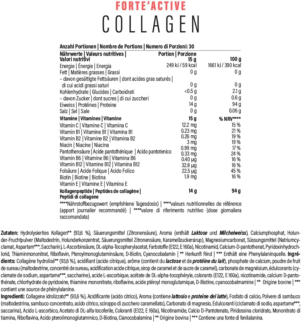 Forte’Active Collageen poeder, 450 g, Made in Switzerland, collageen met biotine, vitamine C, D, E en foliumzuur, voor spieren, gewrichten en immuunsysteem, bessensmaak