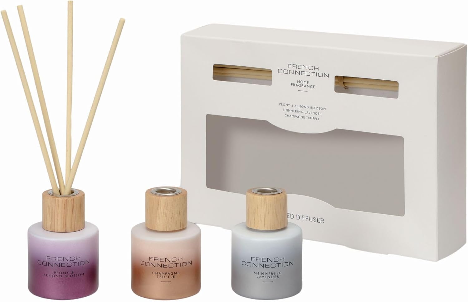 French Connection Ombre Collection Geurende rietverspreider | Luxe huisgeur | 100ML & Trio Gift Set (50 ml x 3, Champagne Truffel, Pioen & Amandelbloesem, Glinsterende Lavendel)