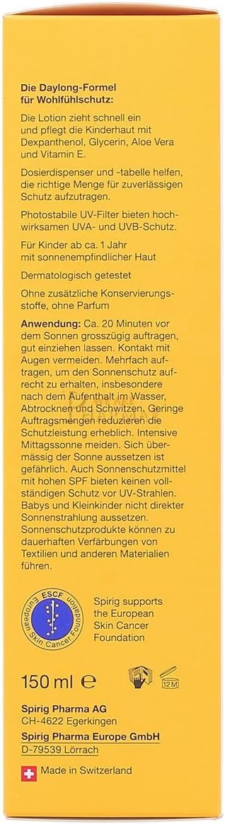Nachdem mir die Daylong Sonnencreme für Erwachsene von meinem Hautarzt empfohlen wurde, habe ich für meine einjährige Tochter eine ebenso gute und sichere Sonnencreme gesucht. Bisher hatten wir uns mit den mineralischen Sonnencremes herum geschlagen, die sicherlich für kleine Kinder die gesündeste Option sind, aber eben naturgemäß schlecht bzw. gar nicht einziehen, sich oft schlecht verteilen lassen und die Kleidung z.T. dauerhaft verfärben. Zudem störte uns bei den meisten Cremes der starke Geruch nach Parfum, der unserer Meinung nach für ein Baby völlig überflüssig ist.Die Sonnencreme von Daylong Kids ist sicherlich nicht die günstigste Variante, die man finden kann. Sie ist aber zumindest unserer Meinung nach das Geld wert. Die Dosierung ist durch den Spender kinderleicht und man findet auf der Flasche sogar eine Dosierungsanleitung je nach Alter des Kindes. Das finde ich wirklich gut, da man doch meistens zu wenig Creme nimmt und dann der angegebene LSF nicht erreicht wird. Die Creme zieht leicht ein, ist nur minimal klebrig und riecht schlicht nach nichts. Die Kleine scheint die Creme überhaupt nicht zu stören. Im Gegenteil, sie streckt uns willig ihre kleinen Beinchen und Ärmchen entgegen, wenn wir sie morgens eincremen. Ich denke auch, dass wir mit der Creme eine Weile auskommen werden, da sie sehr ergiebig ist. Auch der Schutz ist bisher wirklich gut. Neulich waren wir am Strand, haben die Zeit verpasst und plötzlich war es mittags mit der höchsten Sonneneinstrahlung. Mein Mann hatte trotz Sonnencreme (nicht die Daylong) einen Sonnenbrand, unser Baby war vollkommen geschützt, zum Glück. Übrigens sieht die Sonnencreme auch sehr schick aus, obwohl das natürlich kein Hauptgrund ist, sie zu kaufen.Ich bin also mit der Creme extrem zufrieden, werde sie immer wieder kaufen und auch weiter empfehlen und benutze sie sogar ab und zu selbst ganz gerne, wenn ich meine eigene gerade nicht in Reichweite habe.