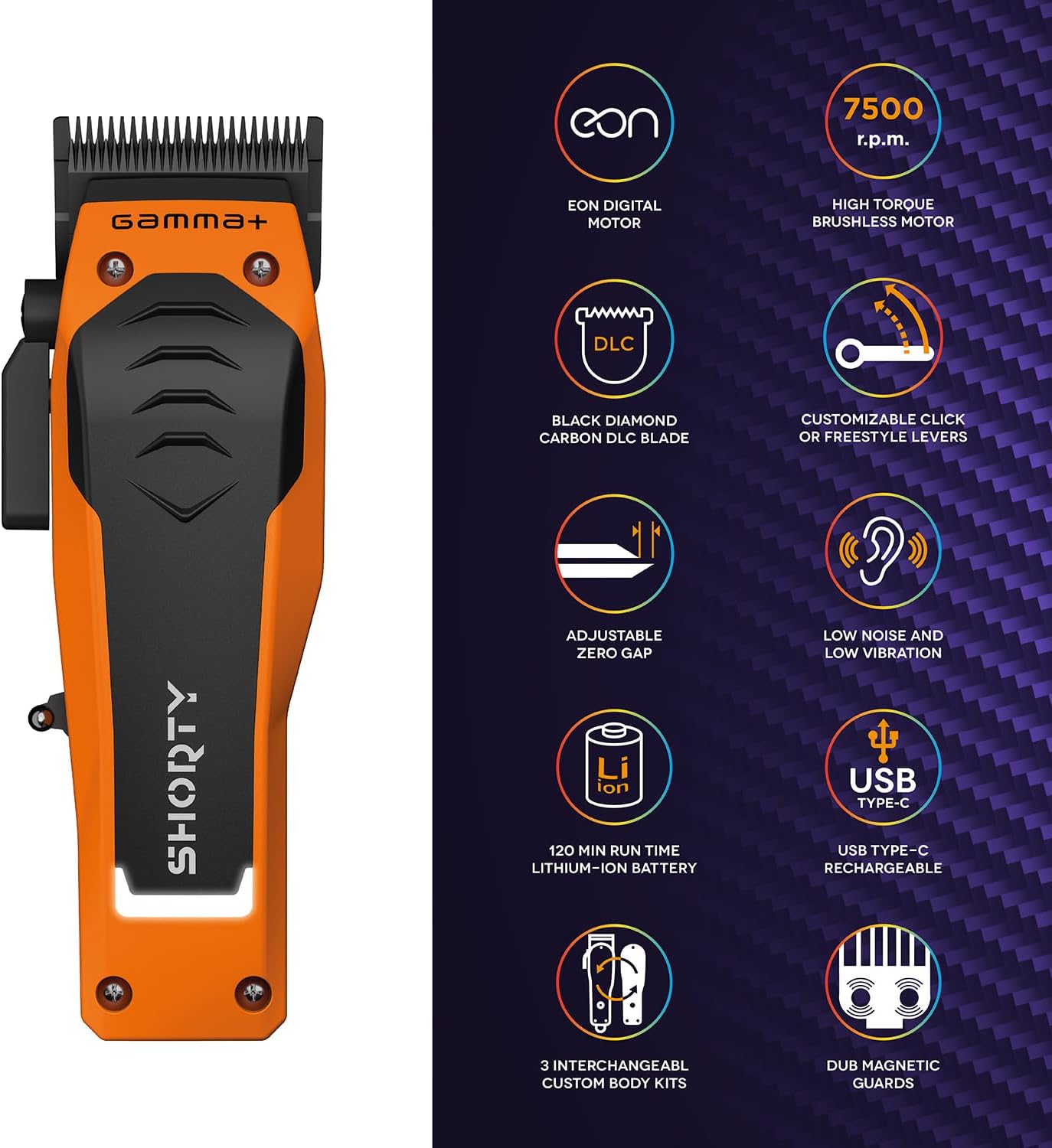 GAMMA+ Shorty Professionele Tondeuse voor Mannen, Compacte Afmetingen, Borstelloze Motor EON, 120 Min Draadloze Autonomie, Scheermes Instelbaar, 4 Opzetstukken, Blade Ondersteuning, USB Type-C-kabel