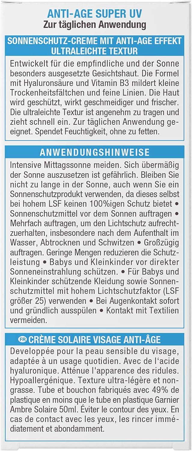 De Garnier Ambre Solaire anti-Age Super UV-zonnecrème SPF 50 beschermt de huid permanent tegen uv-straling. De anti-aging zonnecrème bevat bovendien hyaluronzuur, dat rimpels vermindert. Het gaat tekenen van vroegtijdige huidveroudering tegen en geeft een natuurlijk jonger uitziende huid. Hyaluron staat bovendien bekend om zijn hydraterende eigenschappen. Bovendien bevat de formule vitamine B3, dat kleine droogheidsrimpels voorkomt. De textuur is ultralicht, geeft een aangenaam huidgevoel en trekt snel in. Daarnaast heeft de tube van de zonnecrème 49% minder plastic. Voor een stralendere en jonger uitziende huid.