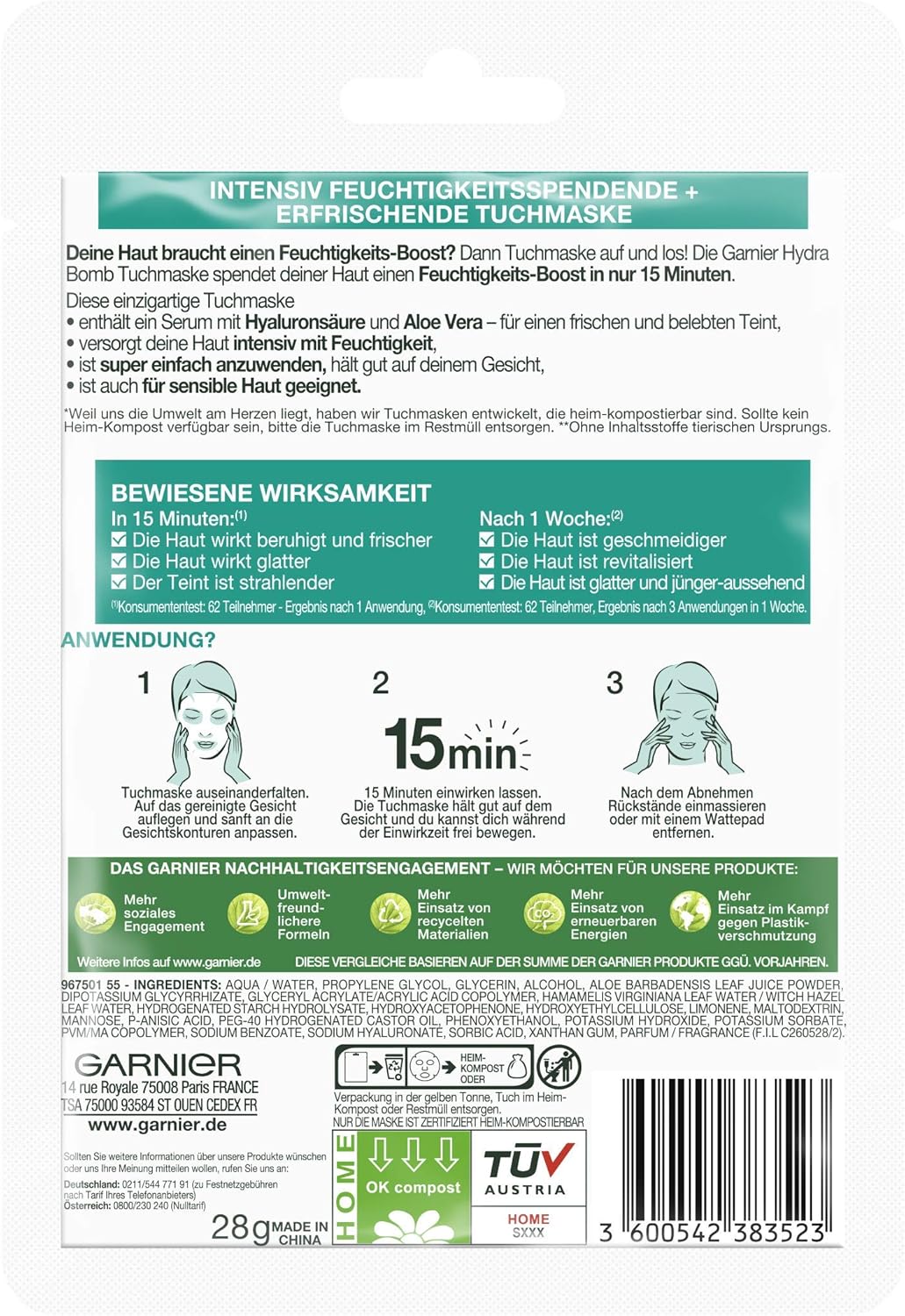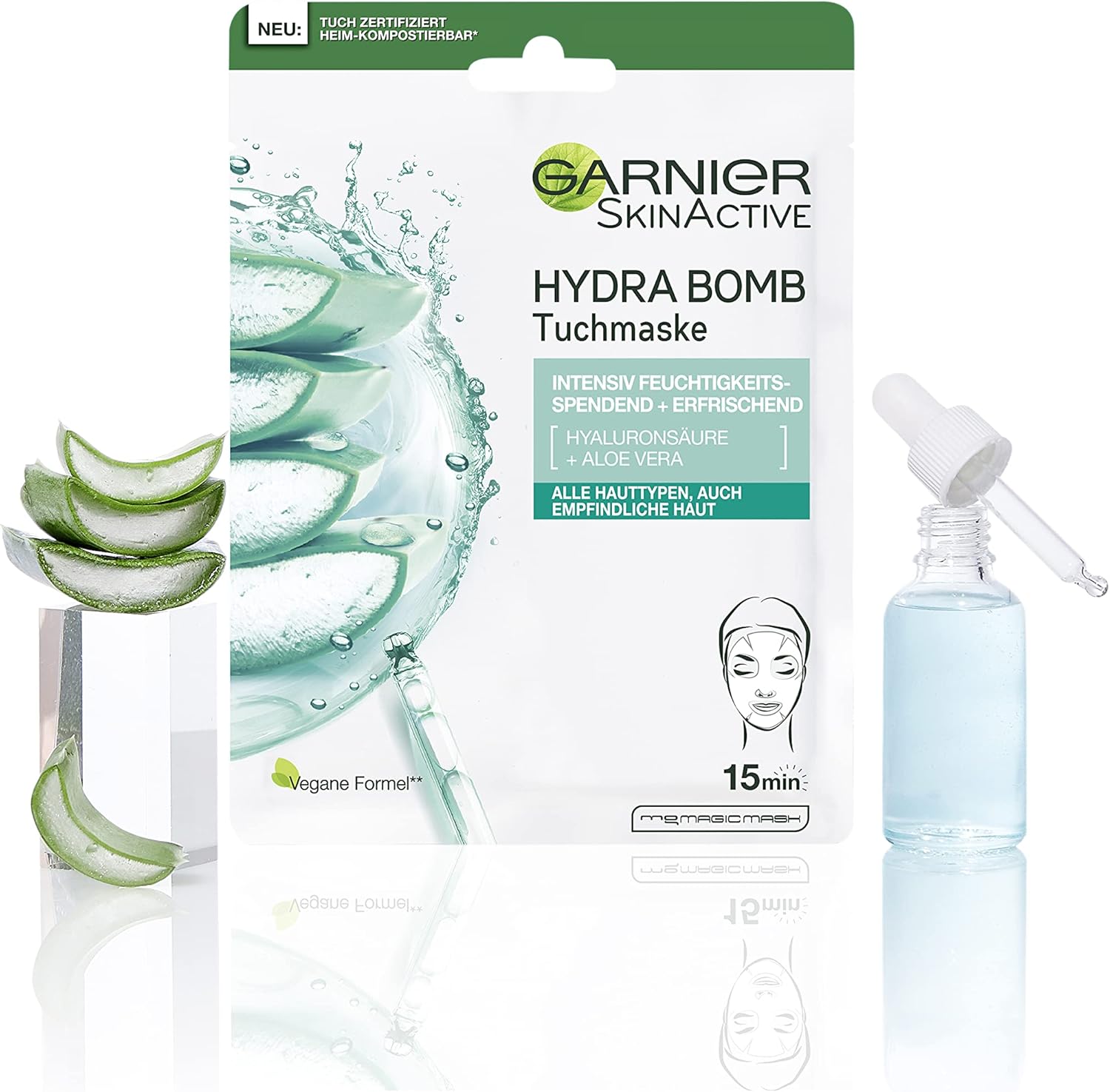 Garnier Doekmasker, gezichtsmasker voor alle huidtypes, verfrissend en hydraterend, met hyaluronzuur en aloë vera, Hydra Bomb, 28 g