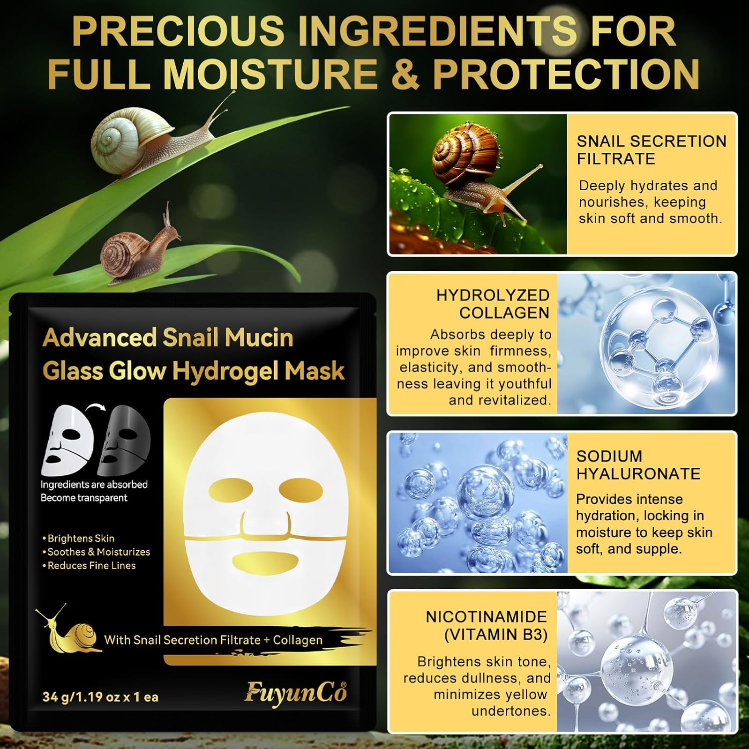 Geavanceerd Snail Mucin Glass Glow Hydrogelmasker, collageen gezichtsmasker, hydraterend masker, minimaliseert poriën, gelijkmatige huidkleur, vermindert fijne lijntjes en rimpels