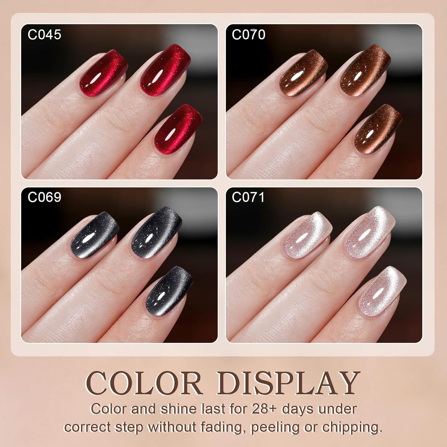 Gel Nagellak Cat Eye, 4 Kleuren Katogen UV Nagellak met Magneet, Rood Zwart Bruin wit Glitter Cat Eye Gel Nail Polish Magnetisch Soak-Off UV voor Beginners Diy Nail Art Manicure Salon, 8 ML