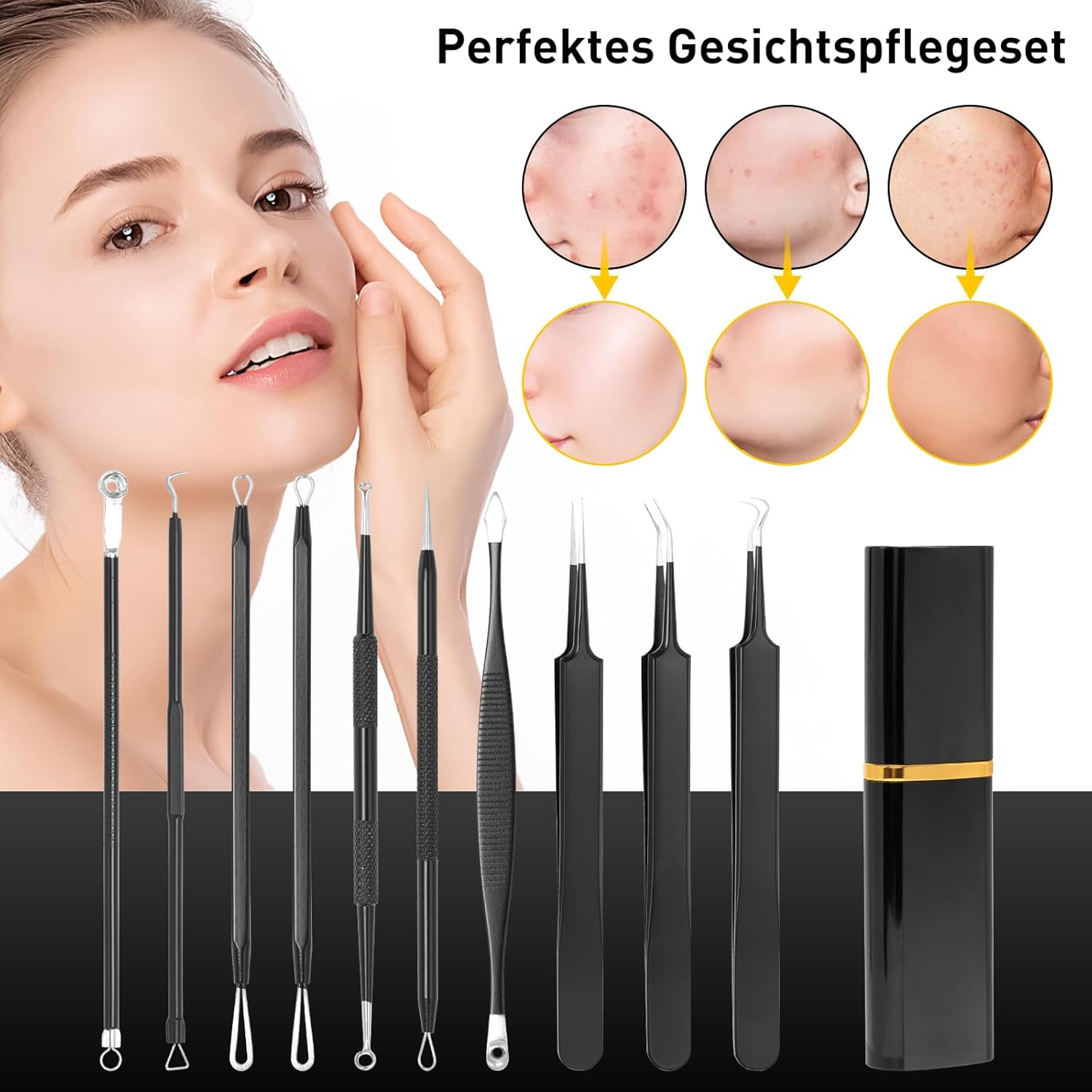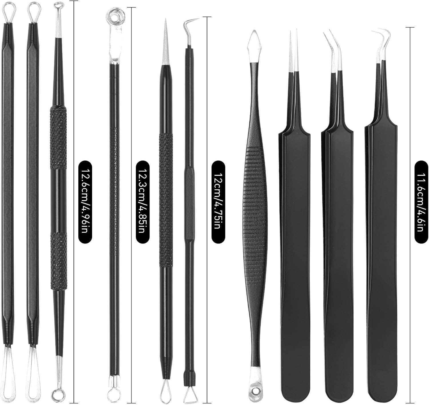 Gereedschapsset voor puistjes, 10 stuks, mee-eterverwijderaar, comedonenknijper, milia-verwijderaar met opbergdoos voor neus, gezichtsverzorging (zwart)