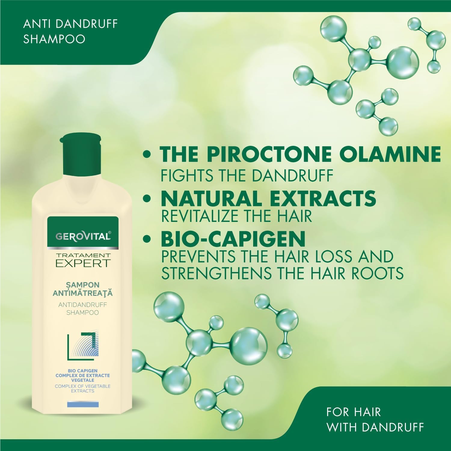 Gerovital Tratament Expert Anti-Dandruff Shampoo is a specific treatment against dandruff and excess sebum without irritating the scalp. The innovative formula, enriched with purifying plant extracts, acts directly on the hair root for an effective and long-lasting anti-dandruff effect. Eliminates visible dandruff from the first use – Regulates sebum for a clean, balanced scalp – Moisturizes and protects the hair, keeping it healthy and shiny. Main ingredients and benefits: ✔ Large burdock – Antibacterial and seboregulatory properties ✔ Rosemary – Stimulates microcirculation and purifies the scalp ✔ Birch – Soothing and strengthening effect ✔ Horsetail es – Rich in minerals for stronger hair ✔ Sage – Powerful natural antimicrobial against dandruff How to use: 1. Apply a small amount of shampoo to damp hair. 2. Gently massage the scalp to activate the formula. 3. Rinse thoroughly and repeat application if necessary. For best results, use regularly and combine with moisturising conditioner from the same line.