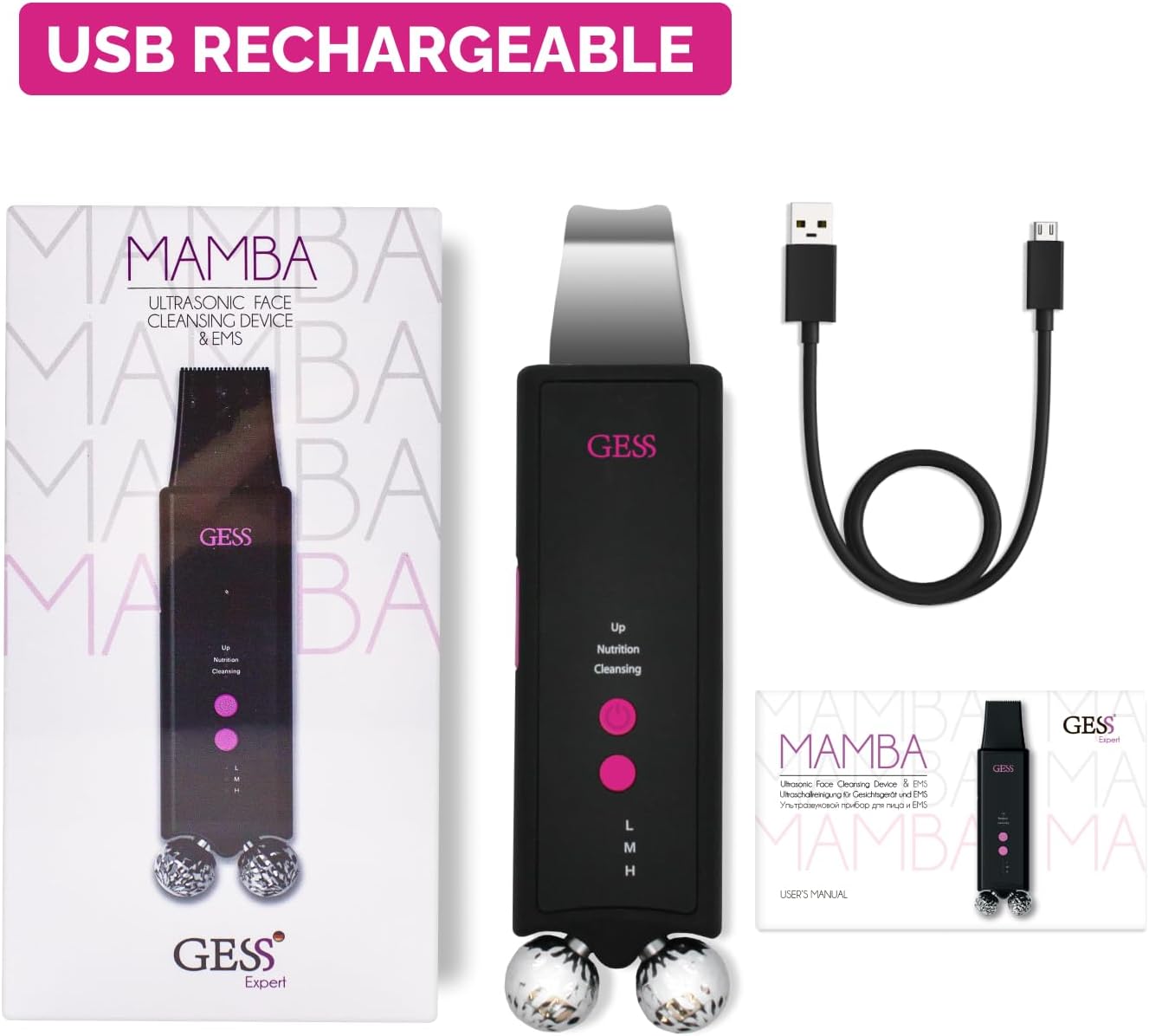 GESS Mamba 2 In 1 Huidreiniger Ems Skin Scrubber Skin Spatula, Mee-eterverwijderaar Poriënreiniger, 3 Modi, Gezichtsroller Tegen Rimpels, Dubbele Kin-verwijderaar