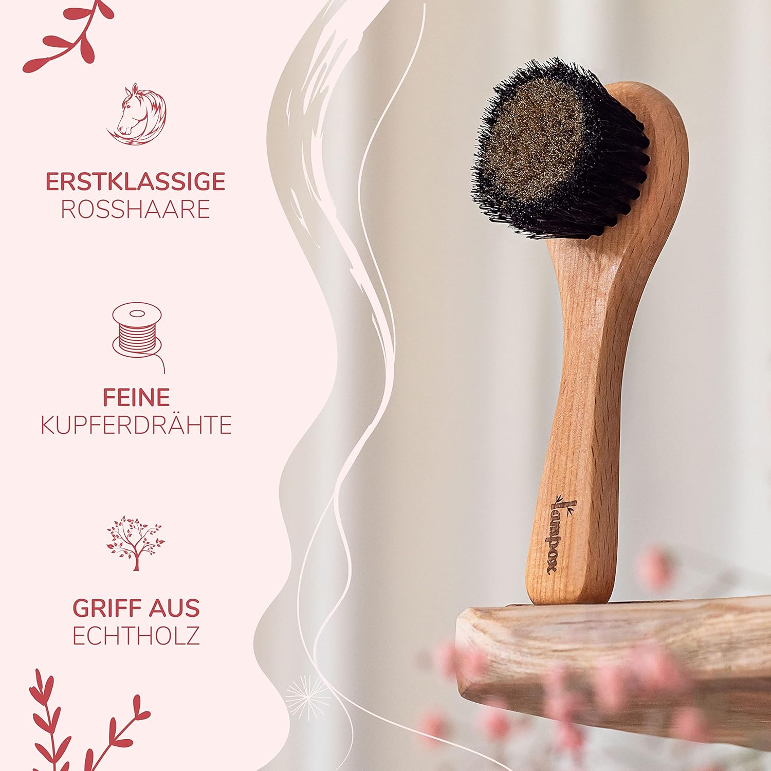 ️ Omvang: handvat van beukenhout, paardenhaar borstelharen (paardenhaar), fijne koperdraden. Groot en gewicht: 13,5 x 5 cm, 60 g. In een milieuvriendelijke kartonnen verpakking.