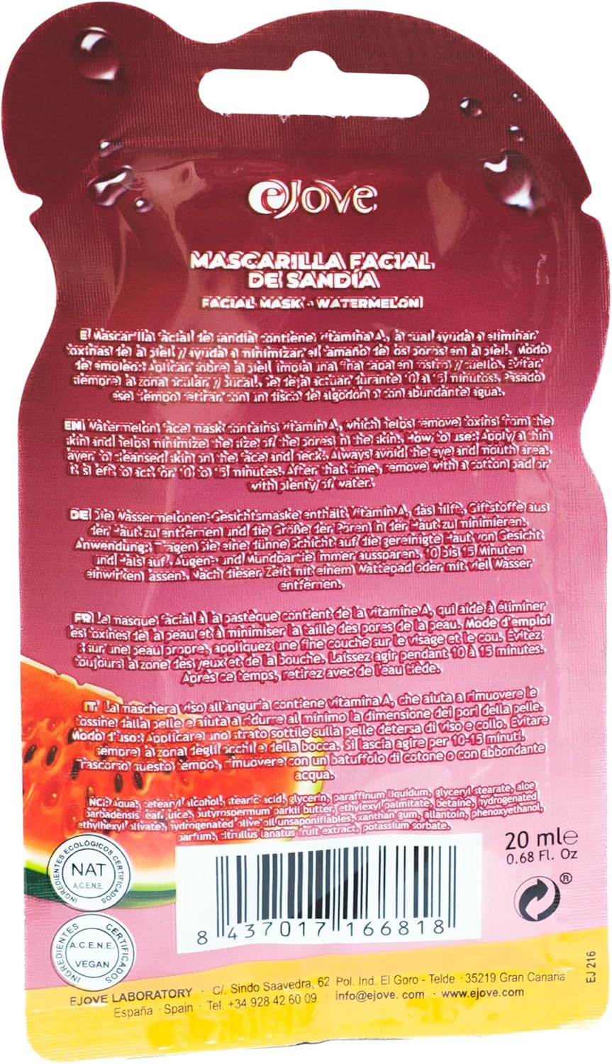 Het Ejove Watermeloen Gezichtsmasker is een verfrissende en revitaliserende gezichtsverzorging die de hydraterende en verjongende voordelen van watermeloen benut. Dit hydraterend gezichtsmasker is ideaal voor alle huidtypes en biedt een effectieve oplossing voor een vermoeide, droge of geïrriteerde huid. Dankzij het watermeloen extract dat rijk is aan vitamines en antioxidanten, helpt het masker de huid te revitaliseren, het vochtgehalte te verbeteren en de huid te voeden. Het is de perfecte natuurlijke gezichtsverzorging voor dagelijks gebruik. Het masker werkt diep in de huid en biedt een verfrissend gezichtsmasker-ervaring die de zintuigen doet ontwaken. Het is ook een kalmerend gezichtsmasker met ontstekingsremmende eigenschappen, waardoor het effectief is tegen roodheid, irritatie en een gevoelige huid. De krachtige antioxidanten in watermeloen dragen bij aan de bescherming van de huid tegen veroudering en helpen de huid te verjongen, waardoor het een uitstekende keuze is voor een Anti-Veroudering gezichtsmasker. Met de rijke combinatie van vitaminen en antioxidanten helpt dit masker de huid te verhelderen, wat resulteert in een stralende huid en een zichtbare vermindering van de tekenen van veroudering. Het gezichtsmasker voor droge huid is perfect voor iedereen die op zoek is naar een verjongend gezichtsmasker dat de huid hydraterende verzorging biedt. Het masker is ideaal voor het herstellen van de balans en het bevorderen van een gezonde, jeugdigere huid. Gebruik dit masker wekelijks voor het beste resultaat en laat de kalmerende gezichtsbehandeling de vermoeide en vochtarme huid verjongen. Het is ook een verzachtend gezichtsmasker dat zorgt voor een comfortabele, zachte huid na gebruik, terwijl het de huid een natuurlijke glow geeft. Watermeloen gezichtsmasker zorgt voor een diepe en verfrissende behandeling die de huid verstevigt en revitaliseert. Alleen voor uitwendig gebruik.