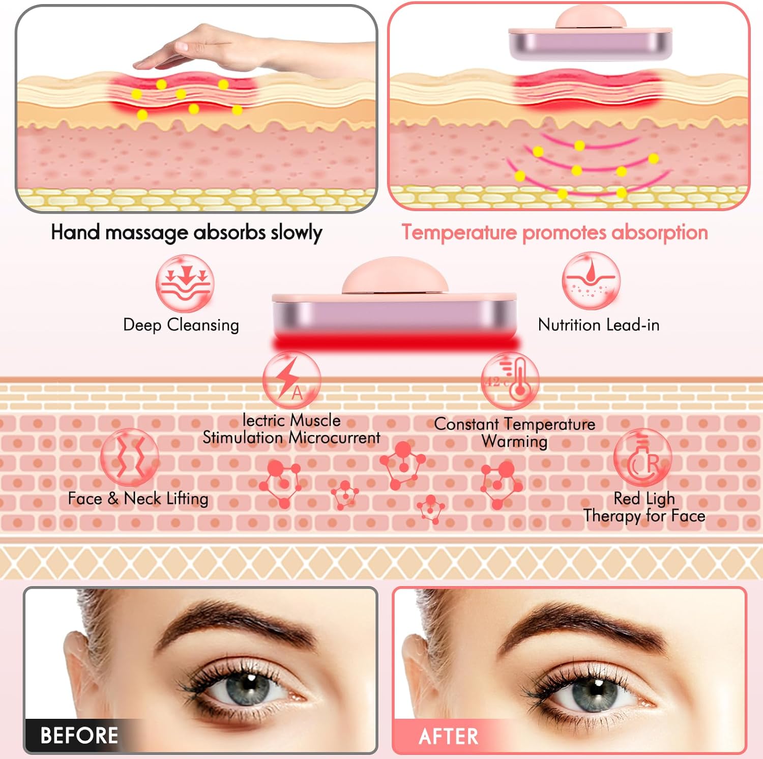 4-in-1 gezichtsmassageapparaat: het gezichtsmassageapparaat maakt gebruik van de nieuwste onderzoeks- en ontwikkelingstechnologie: biologische micro-elektronica + 620-630 nano-rood licht + warmtefunctie + geluidstrillingen, de combinatie van meerdere functies maakt onze huid gladder en strakker.