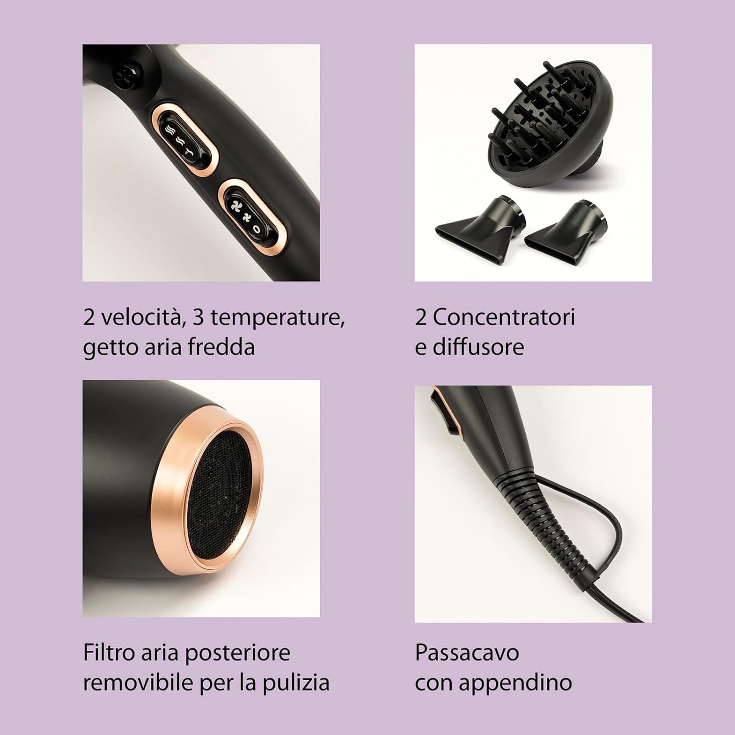 Asciugacapelli leggero, maneggevole, potente e dalle dimensioni piuttosto contenute.In dotazione 1 diffusore e 2 concentratori.