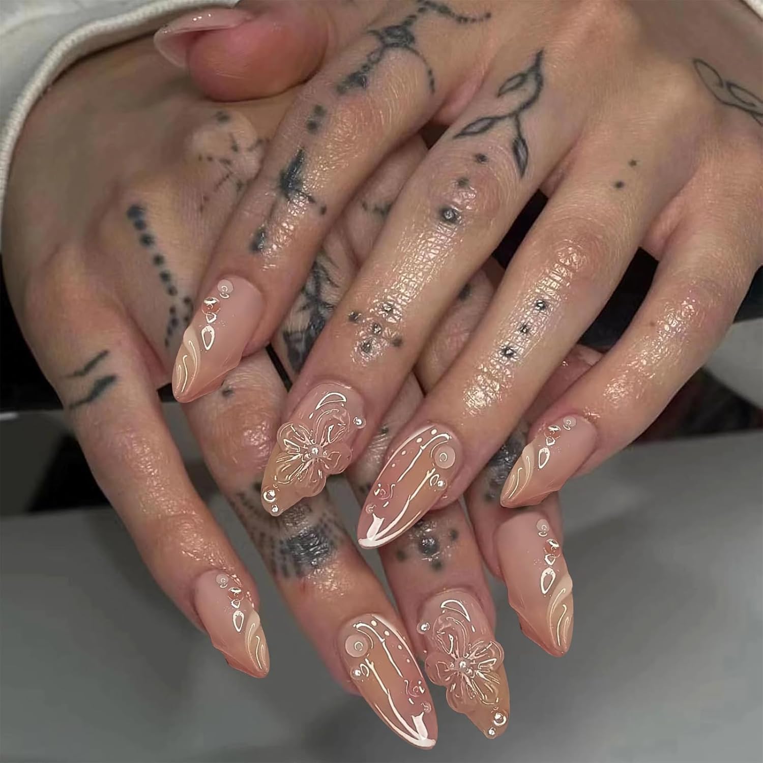 GlamRays 24pcs 3D Handmade Press-on Nails with Charms Medium False Nails Acrylic Nails Press-ons Almond Shaped False Nails with Flowers Water Waves Design Gradient Color