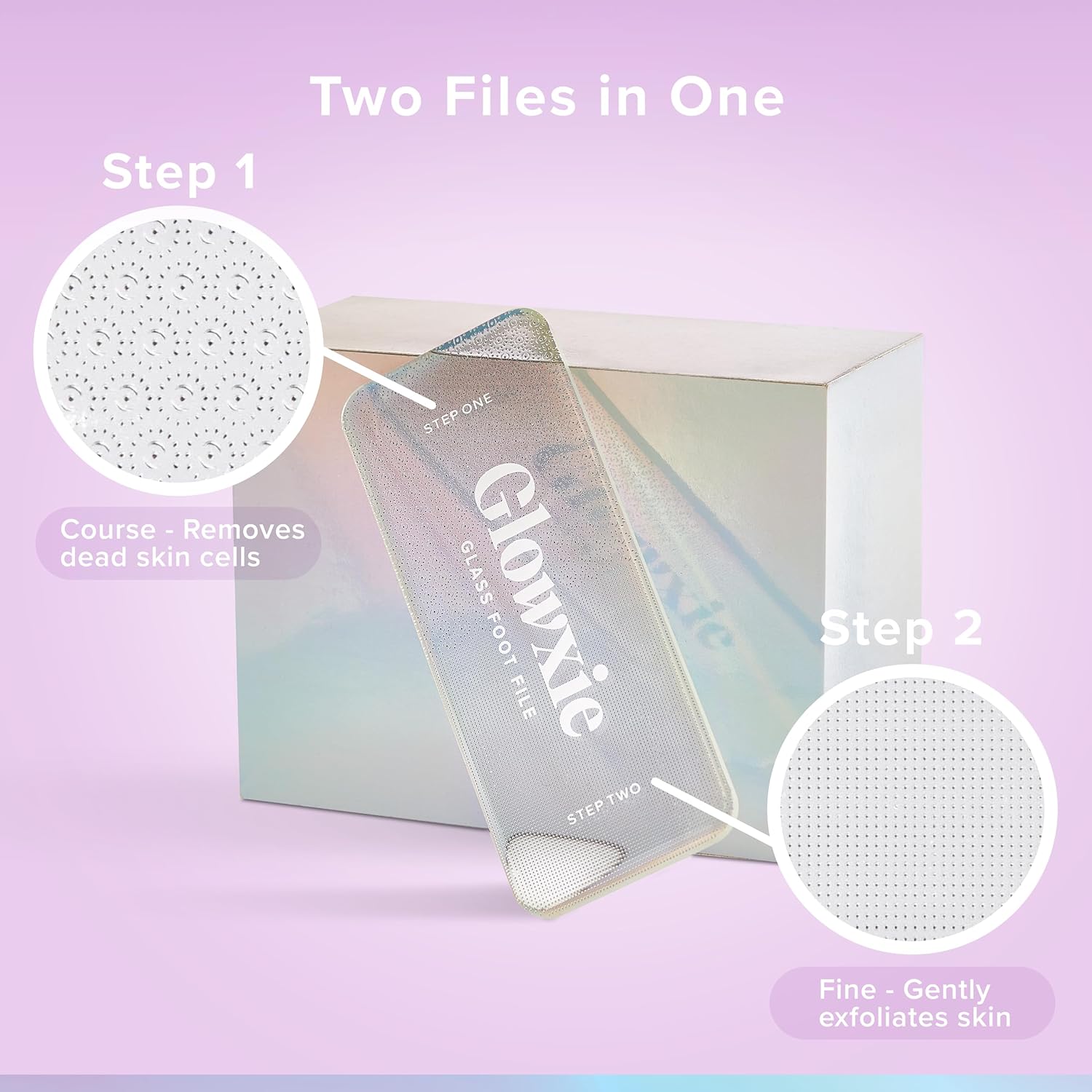 ⭐ Werkt binnen enkele minuten – In tegenstelling tot andere voetschrapers is Glowxie een 2-in-1 glazen schrobber. Stap 1 (grovere vijl) verwijdert snel de harde huid van voeten/hielen. Stap 2 (fijnere vijl) exfolieert de huid zachtjes om de voeten glad en beschermd te maken.