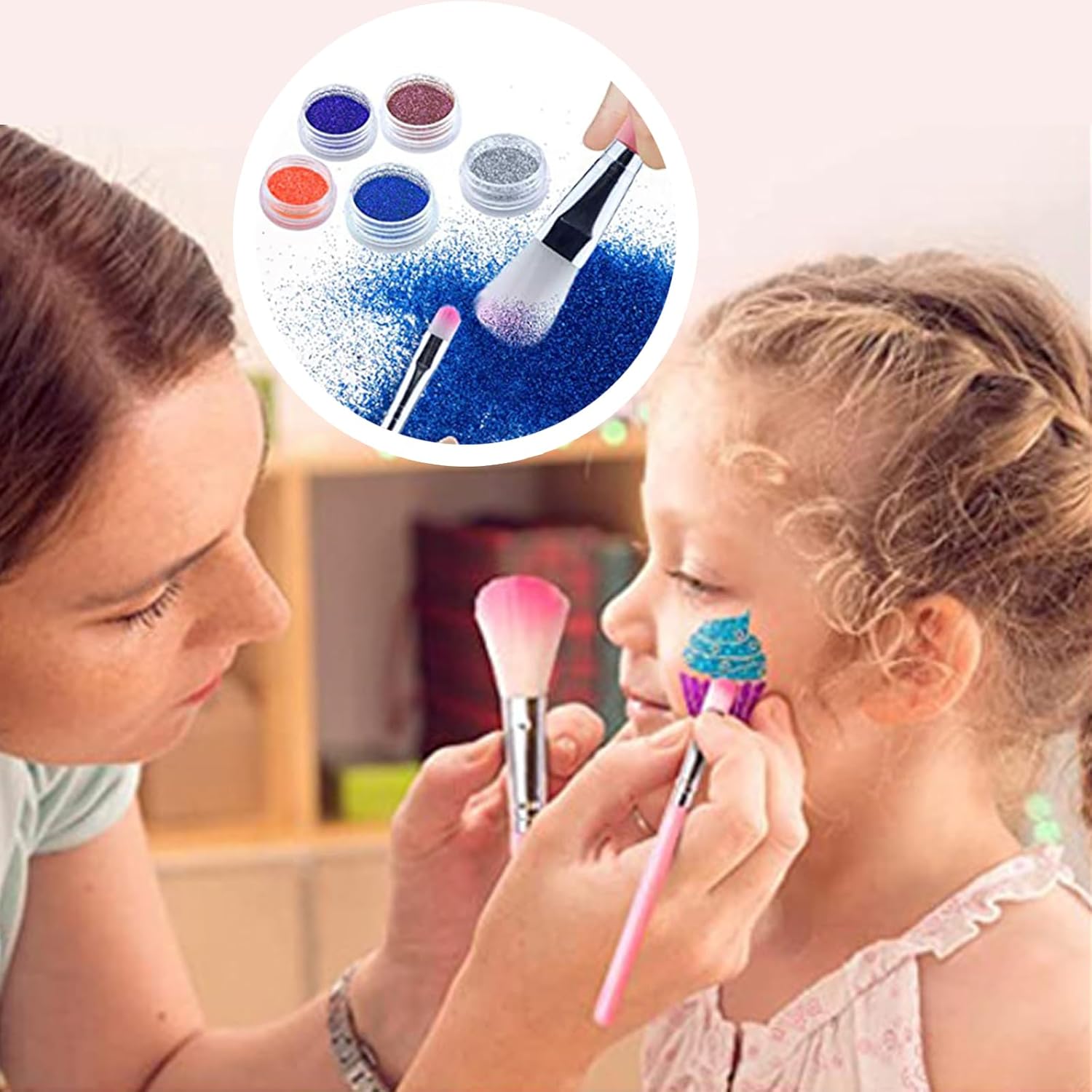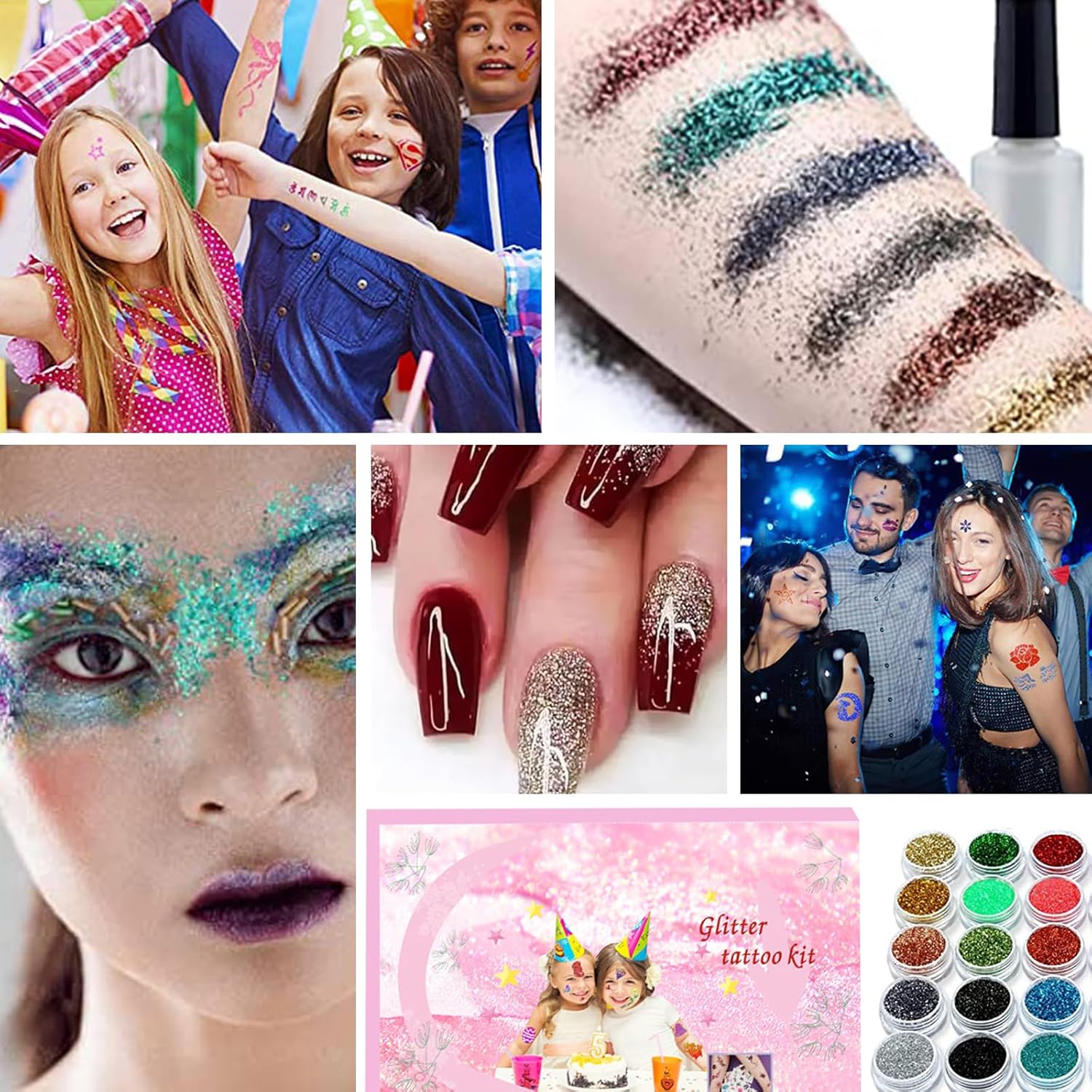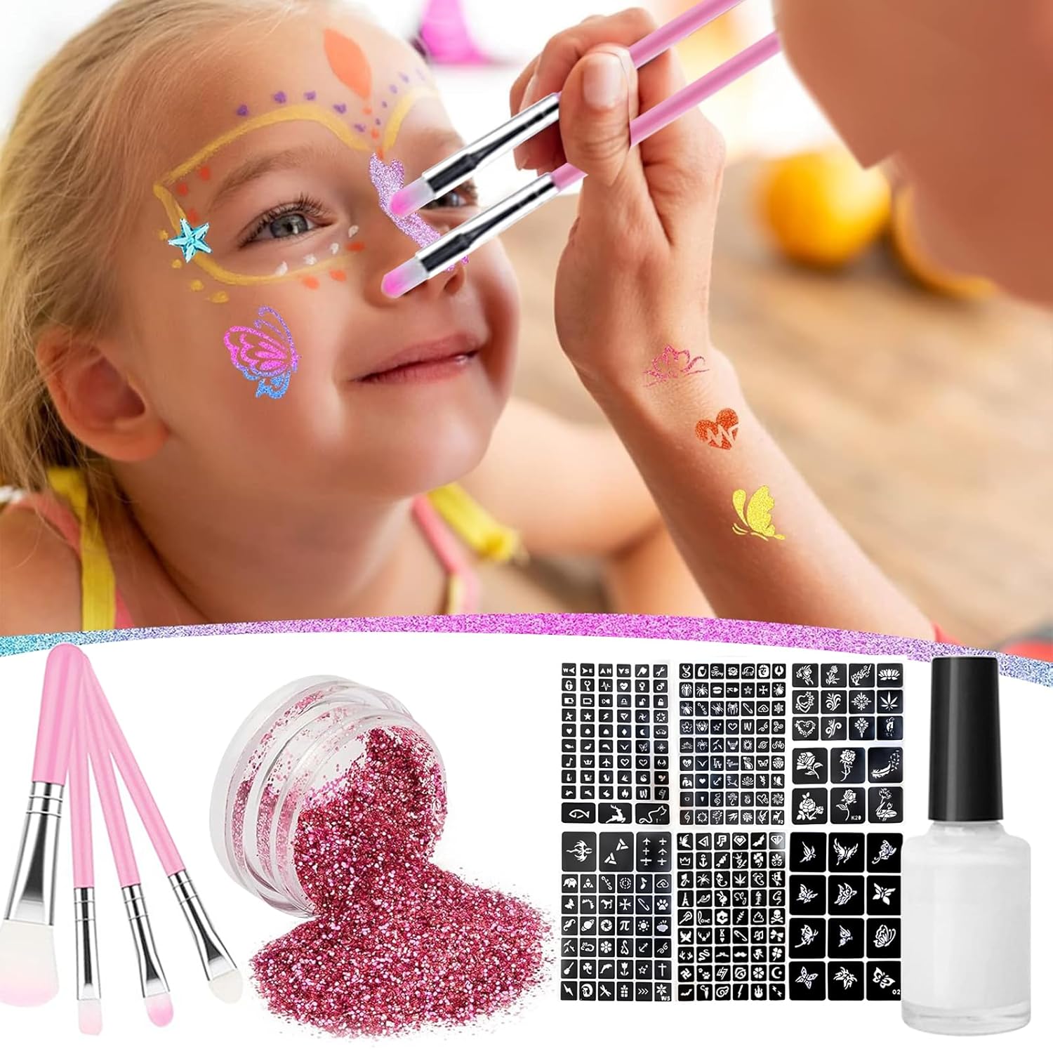 Glitter Tattoo Kit for Kids, Temporary Glitter Tattoo Makeup for Girls – 31 Glitters, Glitter Tattoo Makeup Kit for Kids, 243 Patterns, 2 Bottles Glue, Pink Brush + Color Box