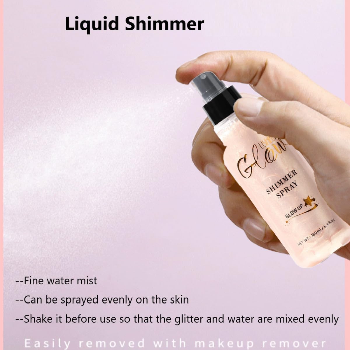 Eenvoudig te gebruiken: onze vloeibare glittersprays kunnen een zeer fijne waterstraal sproeien. Spuit gewoon licht om de fijne glitters gelijkmatig te verdelen. Na het spuiten kan de glans in enkele seconden een film vormen. Efficiënter en nog gelijkmatiger dan highlight-olie of highlighter-crème.