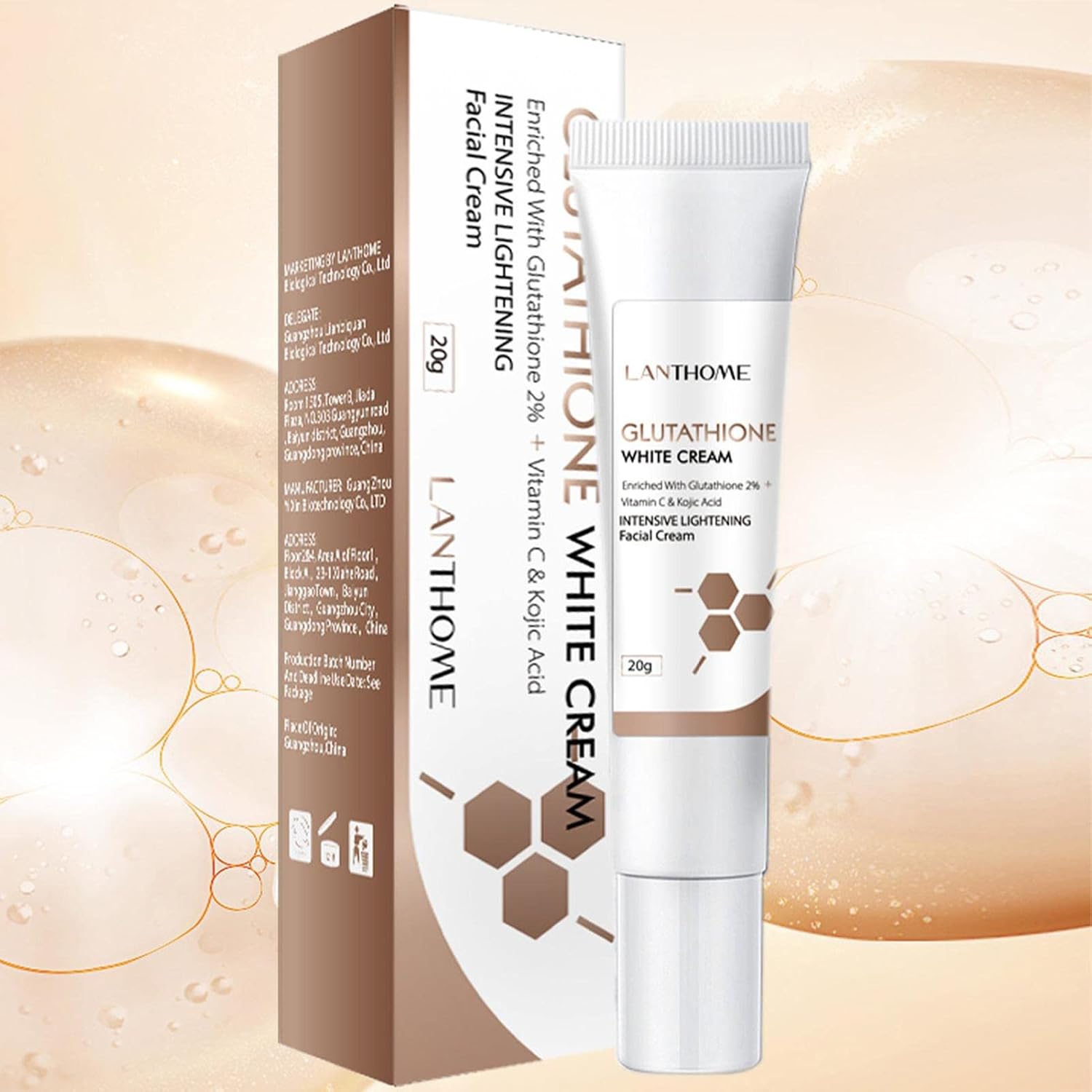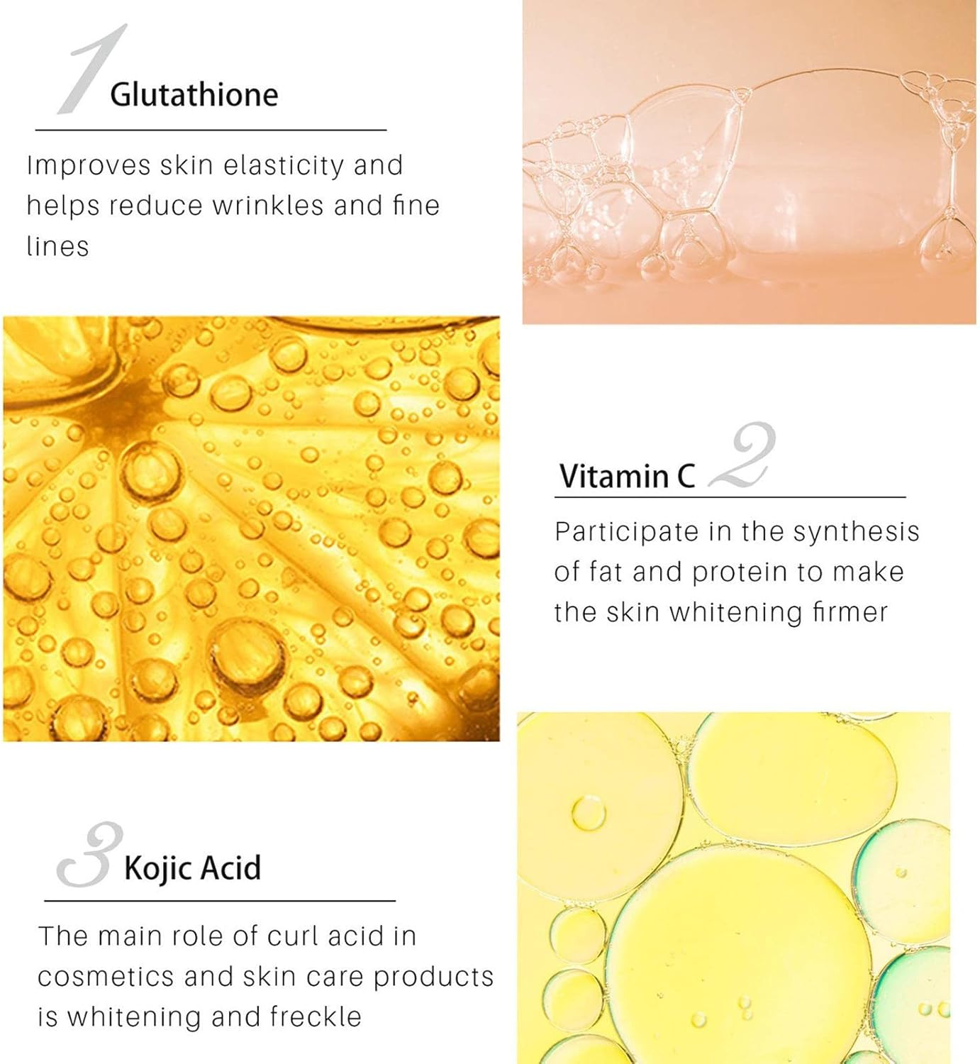 Deze glutathion crème is rijk aan essentiële vitaminen voor de huid enz. C is betrokken bij de synthese van vet en eiwitten en maakt de huid lichter