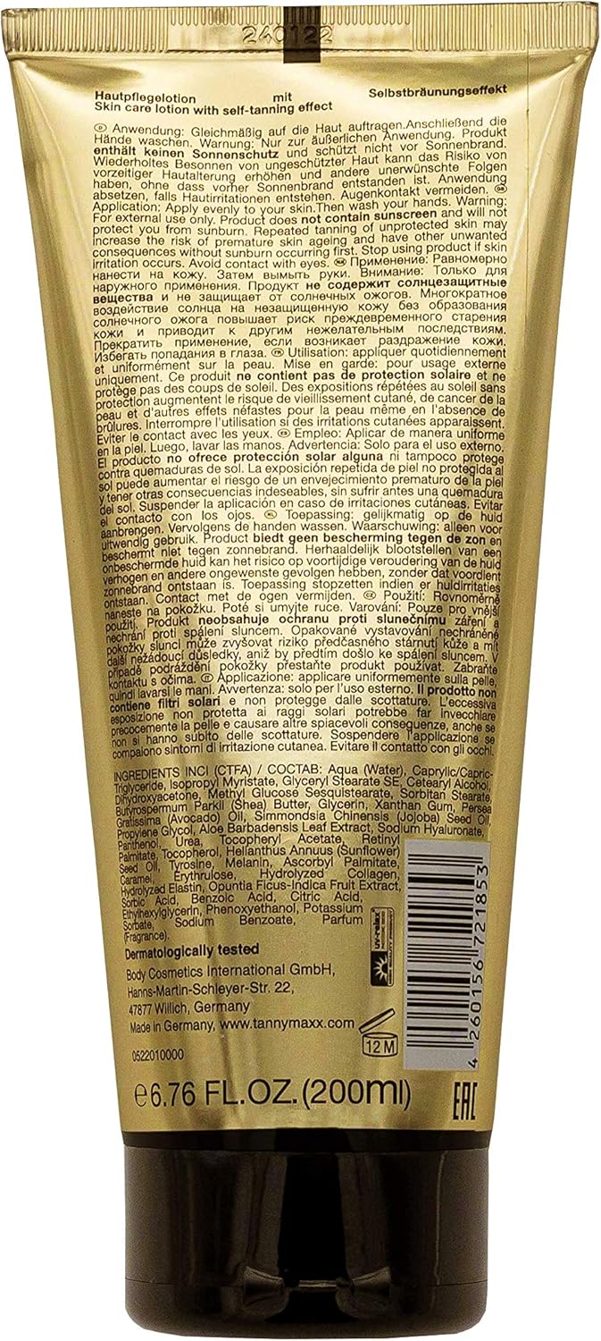 Een mooie bruine tint is vandaag de dag een symbool voor gezondheid en levenskracht. Tannymaxx Gold ondersteunt zowel het natuurlijke bruiningsproces van de huid onder uv-straling als het huideigen regeneratievermogen. Het doel is naast een natuurlijk mooie bruining het behoud van de beschermende functie van je huid. Milde en zeer zuivere ingrediënten zoals ureum voorkomen huidirritatie en hydrateren je huid. Trekt snel in, is niet vettig en heeft een subtiele perziktoets.