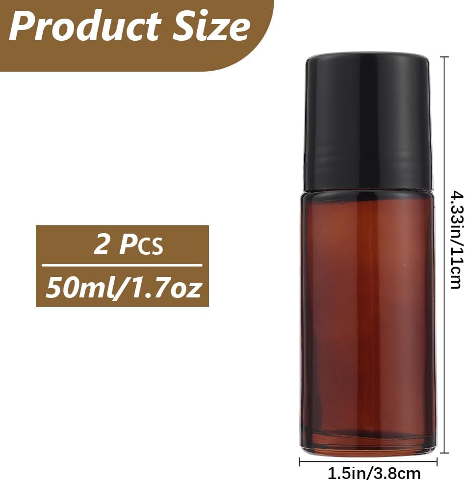 2 stuks 50 ml Tawny Glass Roller Fles: De grootte van elke glazen rolfles is 11 x 3,8 cm; capaciteit: 50 ml/1,7 oz; kleur: tawny fles, zwart deksel; gemaakt van dik glas, plastic rolbal en deksel, duurzaam, herbruikbaar, voor langdurig gebruik