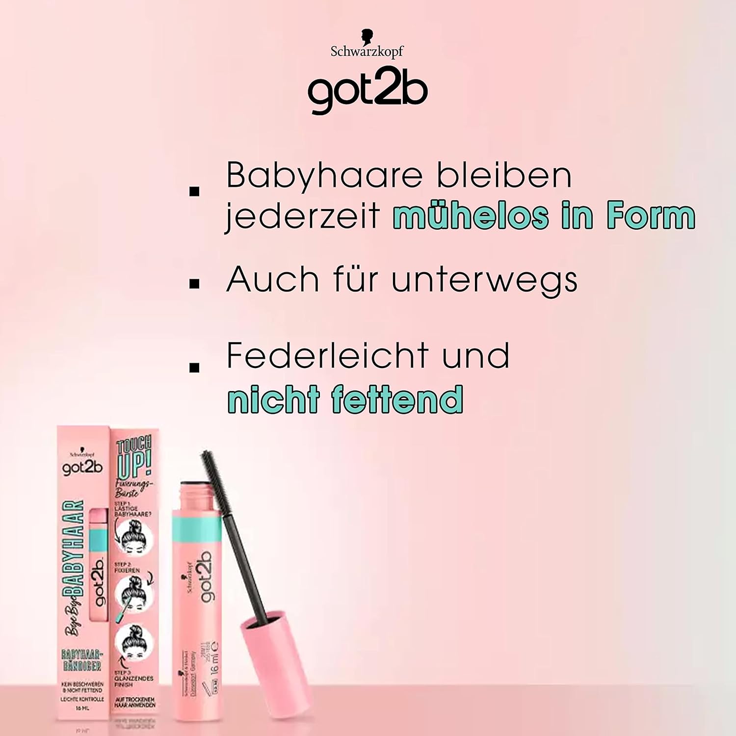 Are you dancing her out of line again? Blind and fix your unruly baby hair in no time with Got2B Bye Bye baby hair. No matter what hairstyle – whether braided braids or cool bons – so the styling can withstand any adventure. Effortlessly shape your baby hair, even on the go. The styling gel formula is feather-light, weighted and non-greasy. Don’t give baby hair a chance.