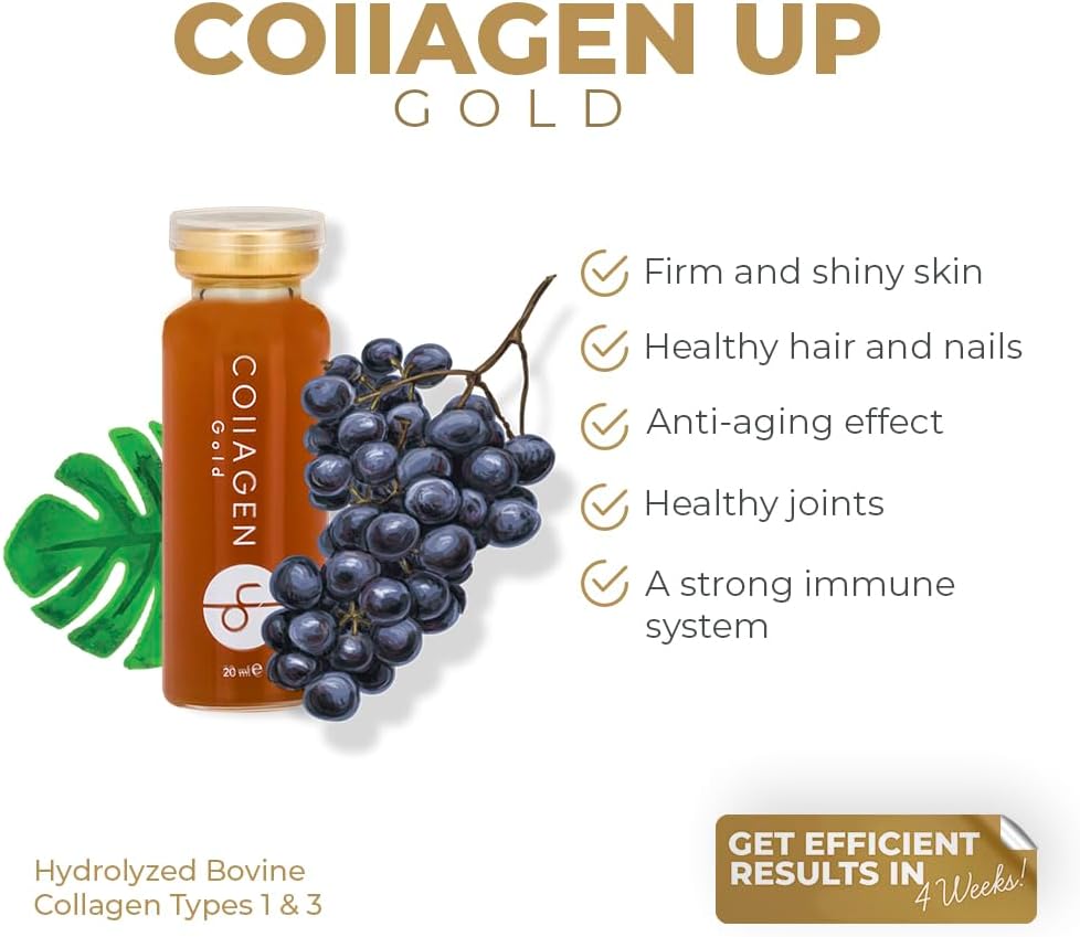 Goud – Rode Druif Smaak Elixir | 5000 mg Gehydrolyseerd Collageen, Co-enzym Q10, Hyaluronzuur en Vitaminen | Voor Huidverjonging en Algemeen Welzijn | 30 Glazen Flesjes