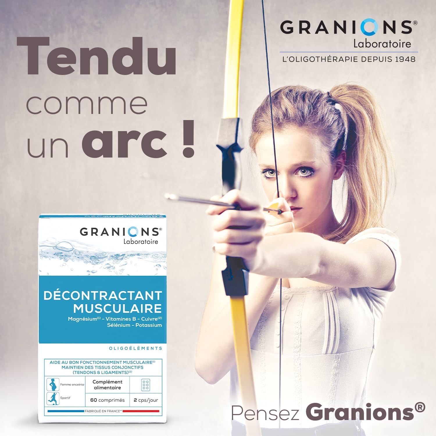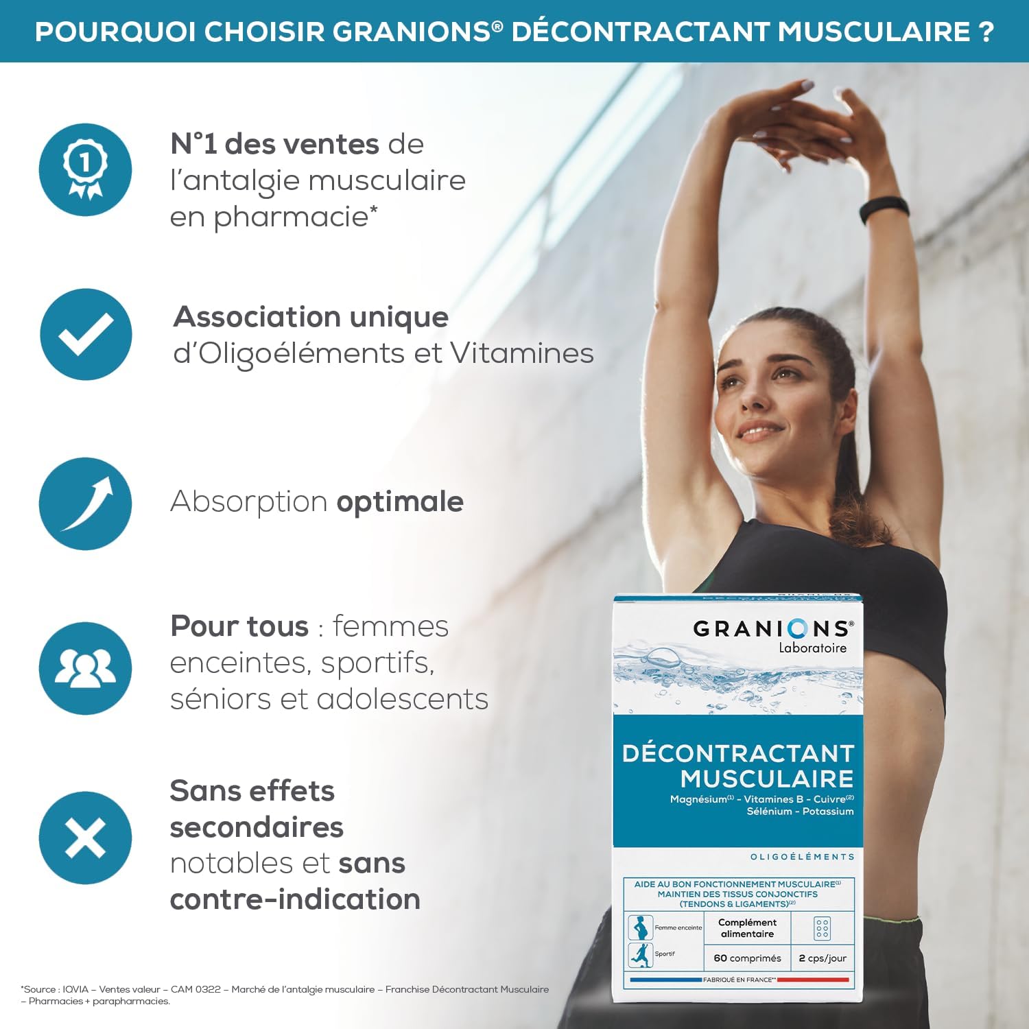 GRANIONS Ontspannend spierkrampen, ongemak, spierstijfheid Magnesium, Vit B, koper, selenium, kalium Voor het hele gezin Gemaakt in Frankrijk 60 tabletten