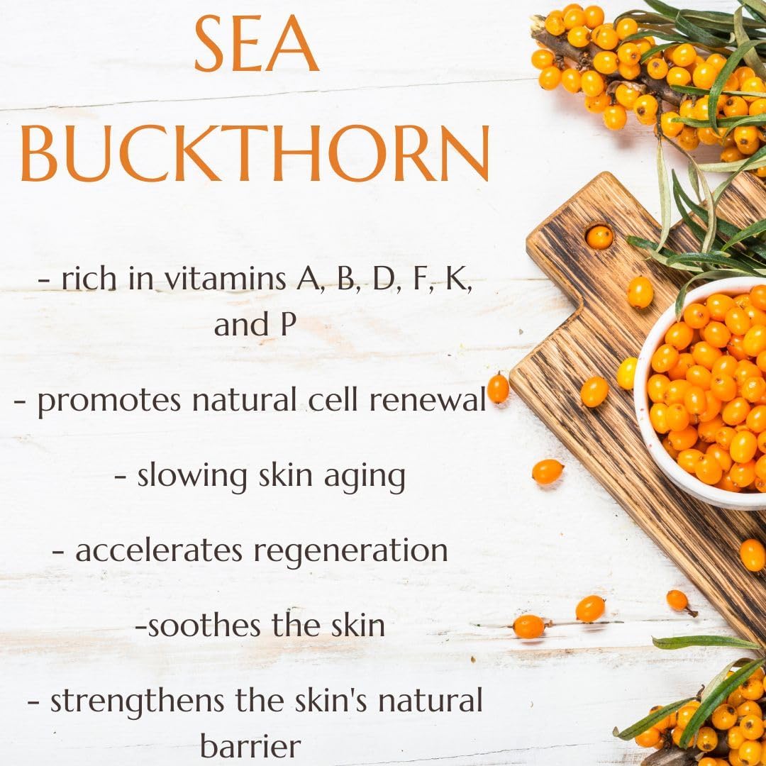 ANTIOXIDANT Sea buckthorn has a strong antioxidant effect (frees the skin from free radicals). It strengthens the skin’s natural barrier function to retain moisture. Sea buckthorn hand cream will make your hands look younger.